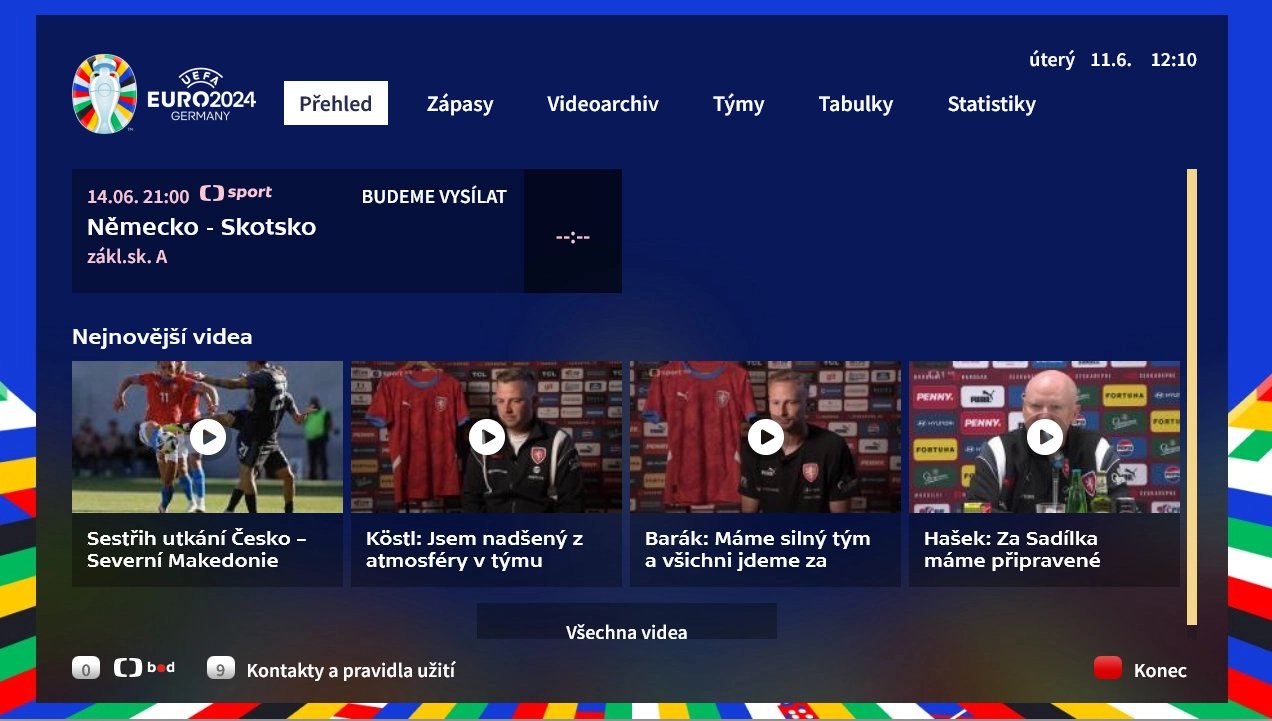 V Německu dnes začíná Mistrovství Evropy ve fotbale. Na programech ČT sport, ČT2 a ČT sport Plus poběží všech 51 utkání v přímém přenosu. Další obsah nabídne nová HbbTV aplikace a web ČT sport.