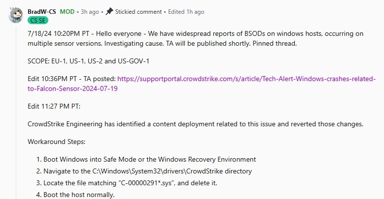 Společnost CrowdStrike oznámila, že už identifikovala příčiny problému a zveřejnila postup, jak jej provizorně vyřešit: uživatelé mají restartovat Windows v nouzovém režimu a smazat jeden konkrétní soubor: