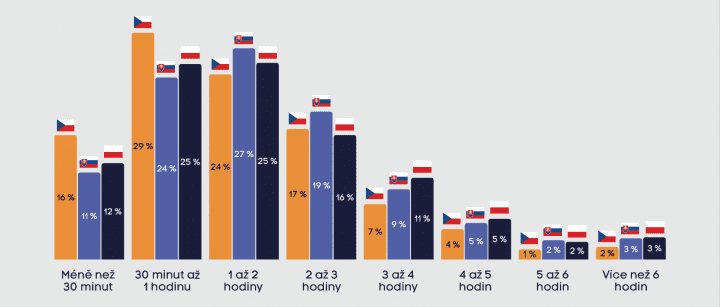 Otázka výzkumu: „Kolik času v průběhu běžného dne strávíte na všech Vámi užívaných platformách sociálních médií (např. Facebook, Instagram, TikTok, X)?“, Zdroj: CEDMO Tracking V4+5 (zadavatel: Univerzita Karlova, sběr dat: IPSOS), N (ČR) = 1 808, N (SR) = 1 958, N (PL) = 2 287