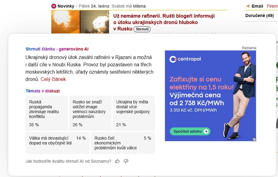 Ukázka AI souhrnu článku na hlavní stránce Seznam.cz