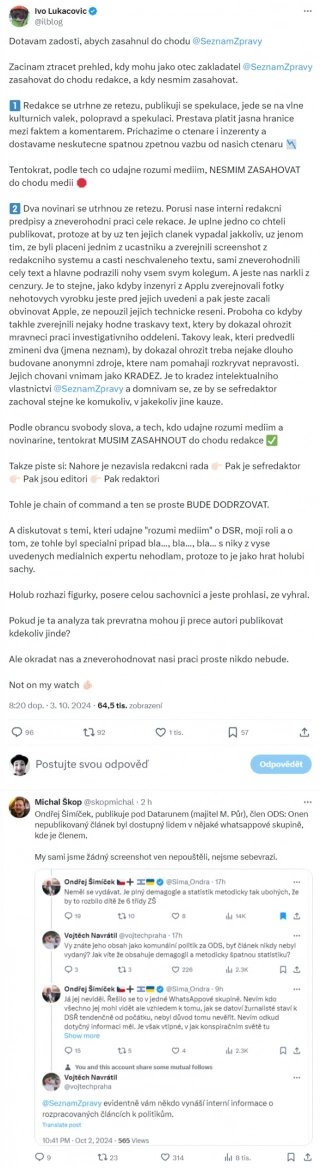 AKTUALIZACE 3. 10. 11:20 – K případu se na svém účtu na X vyjádřil majitel Seznamu Ivo Lukačovič. Ve svém příspěvku obvinil Škopa a Mahdalovou z toho, že porušili interní redakční předpisy a že „…zveřejnili screenshot z redakčního systému s částí neschváleného textu…“