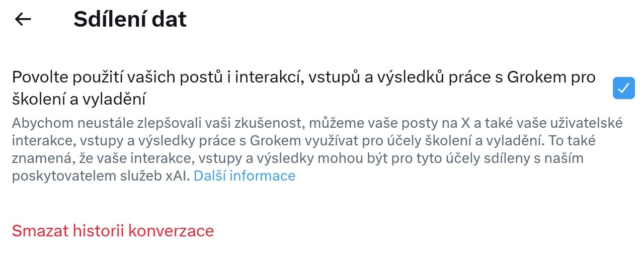 Uživatelé sociální sítě X (dříve Twitter) mají v nastavení ve výchozím stavu zaškrtnutý souhlas s tím, že firma může používat jejich data používat k trénování svého AI chatbota Grok. Jde o veškeré posty, uživatelské interakce nebo výsledky práce s chatbotem.