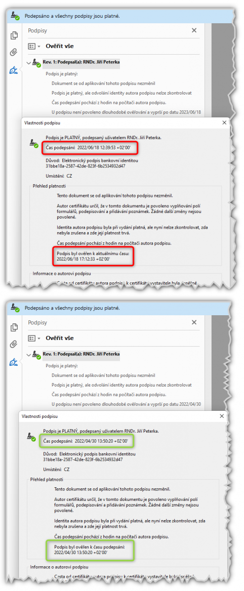 Nicméně pokud máte v ruce jen „jednostranně podepsaný“ dokument (buď z veřejného dema, nebo z narozeninové aplikace), nemáte žádné jeho spolehlivé ukotvení v čase. Proto by platnost podpisu (i pečeti) měla být ověřována k aktuálnímu času, jako je tomu v horní části následujícího obrázku. V případě „nových“ koncových certifikátů vydávaných s dobou platnosti jednoho roku to v jeho průběhu není problém.