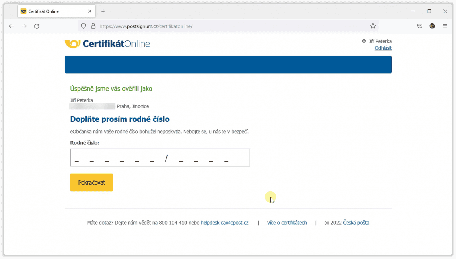 Není mezi nimi rodné číslo (a ani nemůže být, protože státem vedená elektronická identita v základních registrech je nezahrnuje). Ale PostSignum vaše rodné číslo chce znát, a tak si jej alespoň napoprvé (při prvním přihlášení ke službě Certifikát Online) od vás vyžádá.