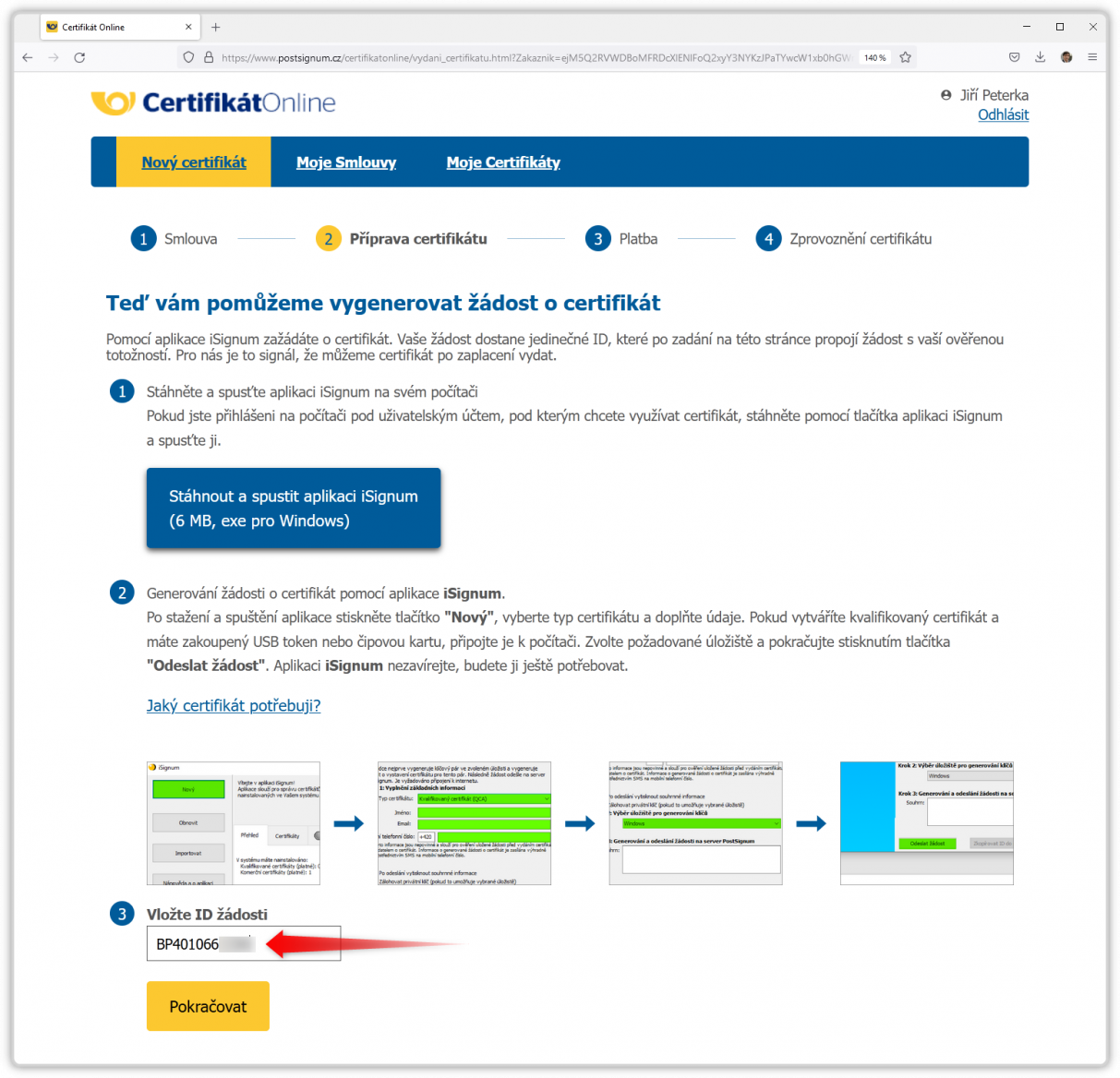 Pokud smlouvu již máte, v dalším kroku se již dostanete k formuláři s možností zadání ID vaší žádosti (viz dřívější obrázek). Ten vás také poučí o tom, jak máte postupovat pro vydání „technické“ žádosti pomocí aplikace iSignum (končící vygenerováním ID žádosti).