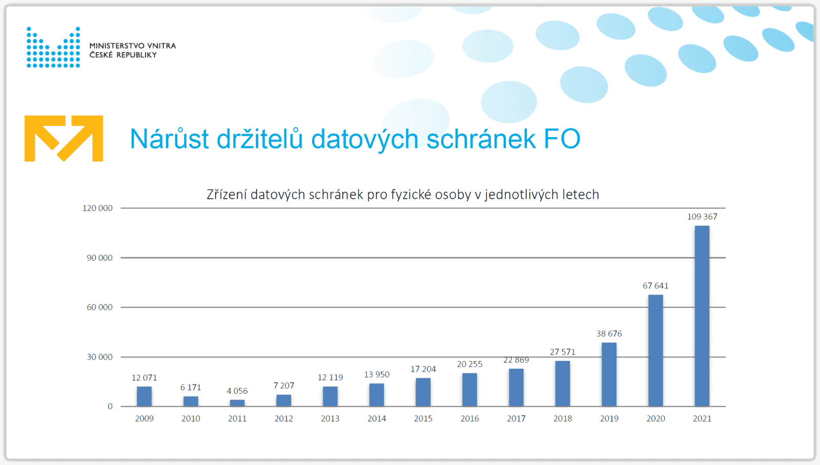 Dalším zdrojem pro vnitrem očekávaný nárůst datových zpráv může být samotný nárůst počtu datových schránek. Následující obrázek z nedávné prezentace MV ČR, který se týká jen datových schránek fyzických osob, ukazuje, že k významnému nárůstu již došlo, v posledních dvou letech nejspíše i v souvislosti s pandemií.