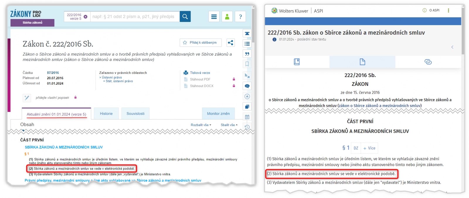 Tato změna znění zákona č. 222/2016 Sb. (který nabyl účinnosti k 1. 1. 2024) se již projevila na jeho aktuálním znění v komerčních službách, např. v Zákonech pro lidi či v ASPI, jak je patrné z následujícího obrázku.