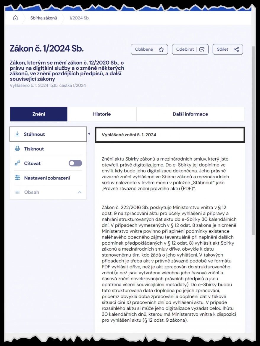 Opět si to můžeme ilustrovat na příkladu nově vyhlášeného zákona č. 1/2024 Sb., který je na e-Sbírce zatím ve své právně závazné podobě (jako PDFko s částkou Sbírky zákonů a mezinárodních smluv), dostupné přes nabídku „Stáhnout“ v levé části předchozího obrázku (nebo přes tento odkaz).