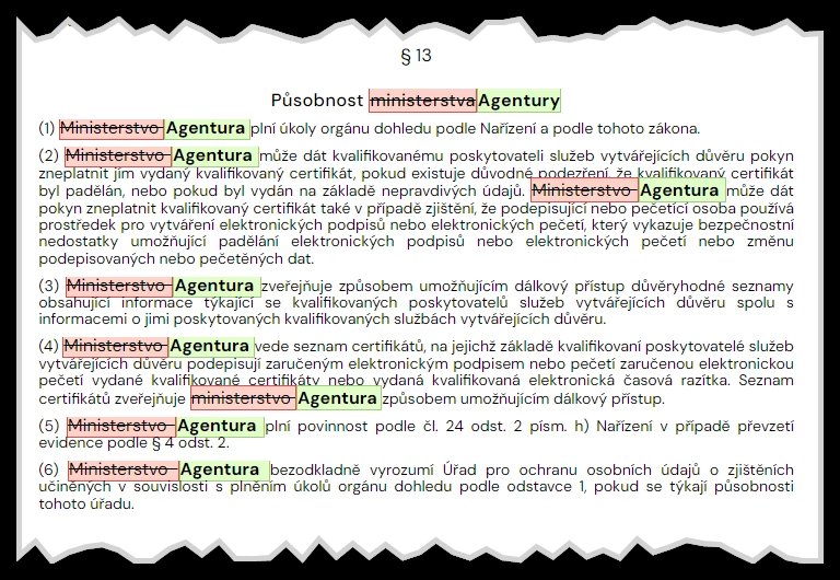 Nicméně u e-Sbírky při rozsáhlejších změnách dochází kvůli jejich zvýraznění pomocí barevných rámečků k nepříjemnému překrývání, které dost znesnadňuje čtení textu. Příklad ukazuje následující obrázek.