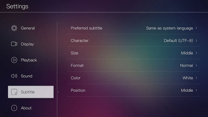 Menu nastavení – nastavení titulků a OTA / USB update