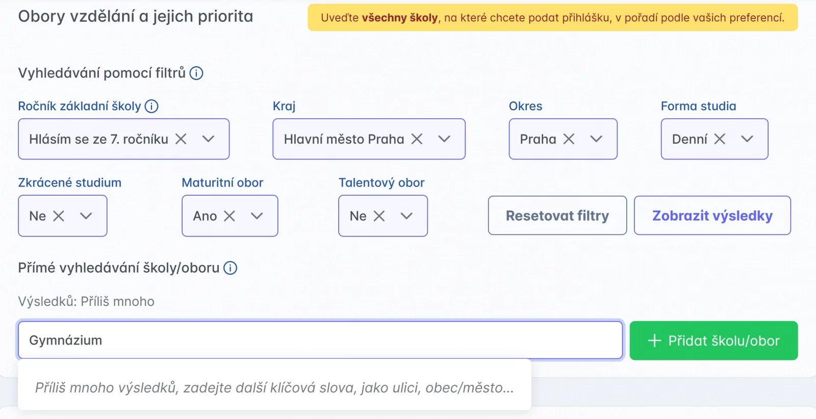 Pokud napojení na registry funguje a k žadateli i jeho zákonnému zástupci se načtou všechny potřebné údaje, postupuje k dalšímu kroku, kde si vybírá obory vzdělávání. I tady ale na něj čeká past. I když vyplní všechny dostupné filtry a parametry vyhledávání, a měl by tak zájem zobrazit jen všechna šestiletá gymnázia v Praze, systém mu odvětí, že výsledků je příliš mnoho.