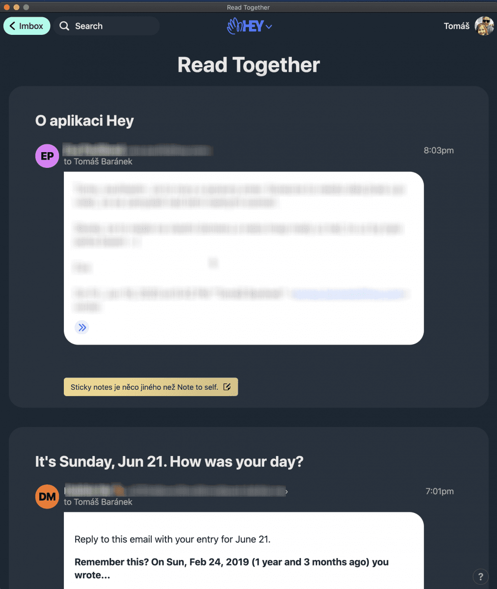 Hey používám asi týden a uvedený radikální přístup Basecampu je na něm znát. Kromě silného ústředního workflow (k němuž se hned dostanu) implementuje i nápady, které už známe z některých e-mailových klientů či služeb – například zaniklého Google Inboxu, SaneBoxu, Canary Mailu, Sparku, Superhuman a dalších. Jako celek se mi Hey líbí; díky renomé zakladatelů cítím potenciál měnit status quo, současně ale vidím i limity tak radikálního přístupu, aspoň v dohledné době.