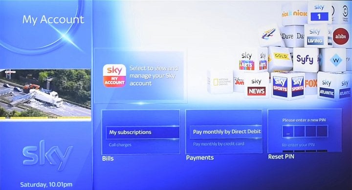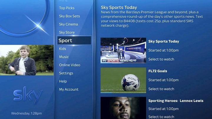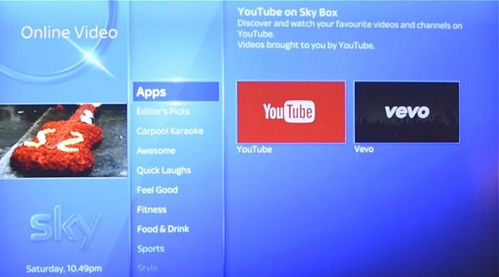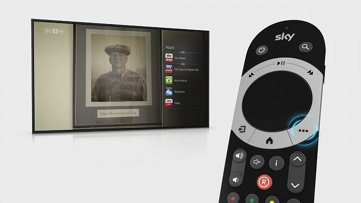 Stisknutím tlačítka vpravo dole pod navigačním křížem (touchpadem) vyvolá menu aplikací přímo od Sky. Jedná se o: Sky News, Sky Sports News HQ, My Photos, Weather a Sky Help.