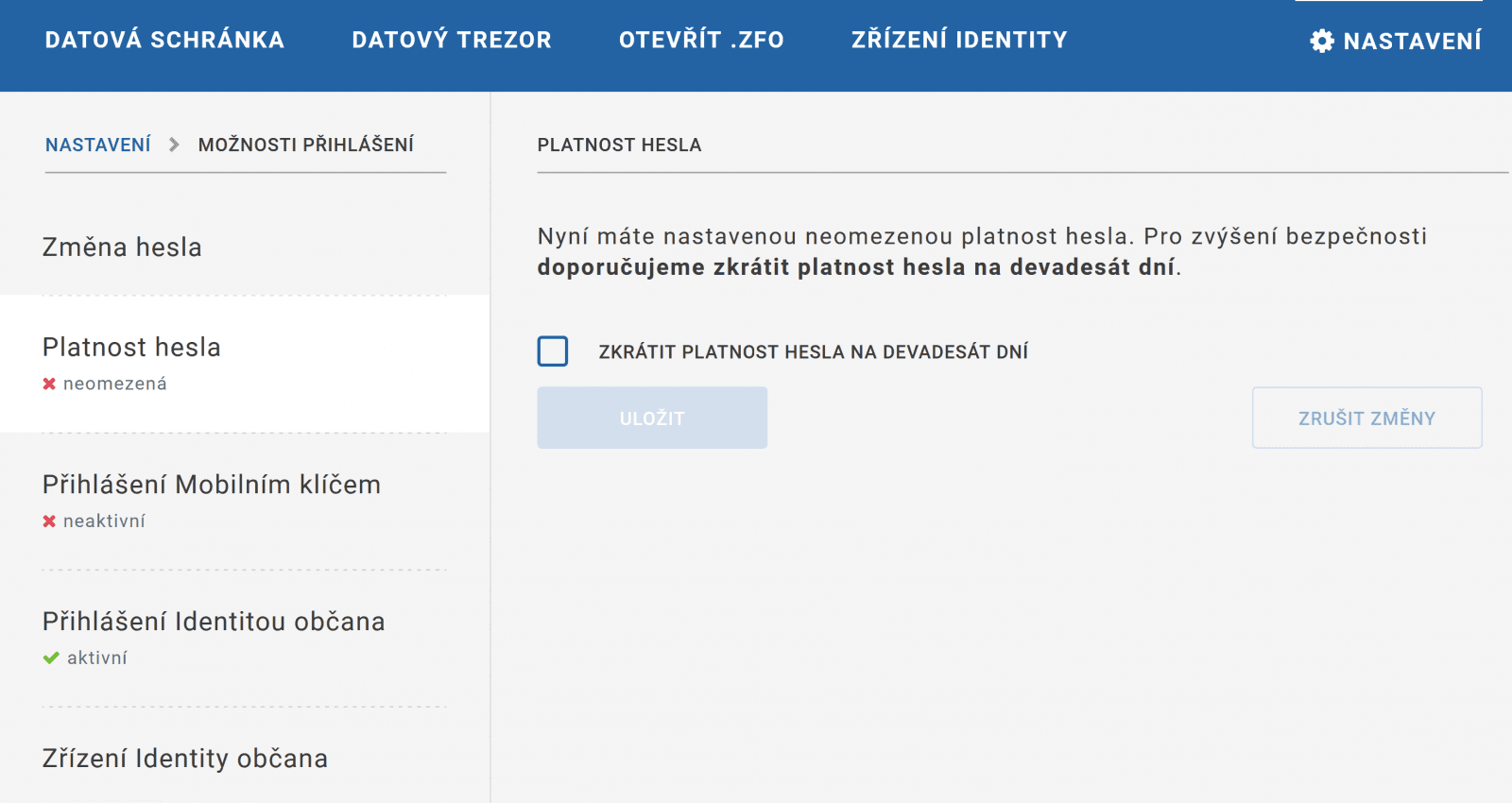 Přihlašovací údaje, tedy uživatelské jméno a heslo pro první přihlášení zadáte na webu mojedatovaschranka.cz. Následně budete vyzváni, abyste si zvolili nové heslo, které pak budete používat pro příští přihlášení. Toto heslo je nutné každých 90 dnů měnit, ale můžete mu nastavit i neomezenou platnost. Dá se to provést v Nastavení > Možnosti přihlášení > Platnost hesla.