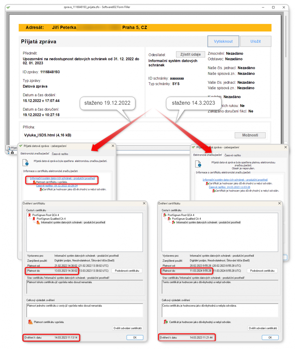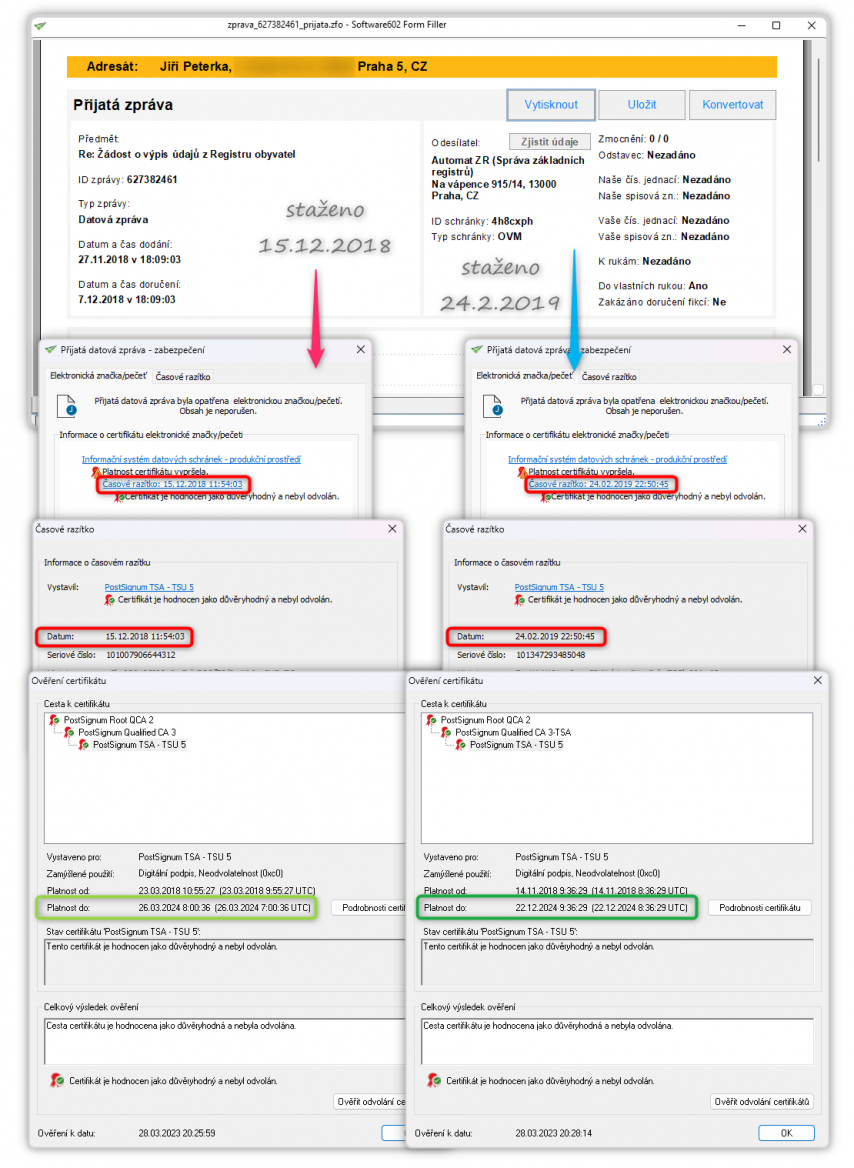 Na dalším obrázku pak vidíte příklad stejné (systémové) datové zprávy z 15. 12. 2022, jakou jsme si ukazovali výše, a to ve dvou exemplářích: jeden (vlevo) byl stažen 19. 12. 2022 v 10:29:34 (jak udává jeho „výstupní“ časové razítko). Druhý exemplář téže zprávy byl stažen 14. 3. 2023 v 11:03:26, jak opět vyplývá z jeho „výstupního“ časového razítka.