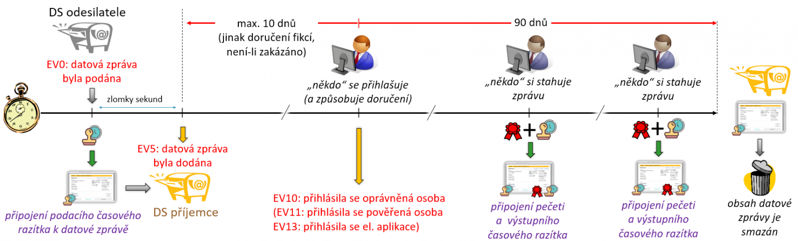 Zpět ale k samotné zprávě: jakmile je tato vložena (dodána) do cílové datové schránky (což je v doručence vyznačeno jako událost EV5), systém nastaví její interní stav na (4). Z hlediska opatřování časovými razítky a pečetěmi se s ní ale už dále (přímo v datové schránce) nic neděje, a to až do jejího smazání (převedení do stavu (9)). A jen pro úplnost si zopakujme pravidla toho, co se s ní děje jiného: