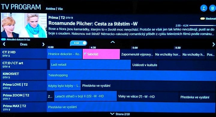 Po programové nabídce se můžete volně pohybovat, na kanál se přepnete buď po vyskočení z EPG, zde nazývaného Guide, nebo přes OK na libovolném pořadu (volba Sledovat).