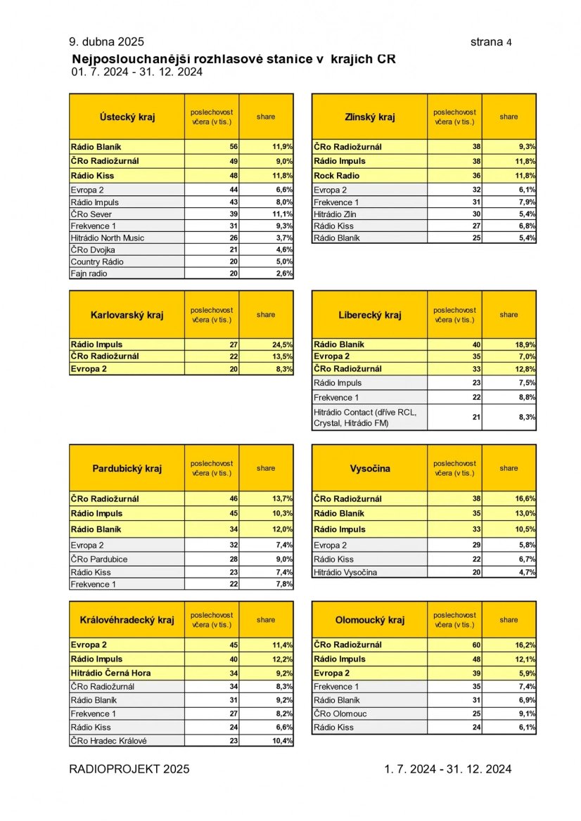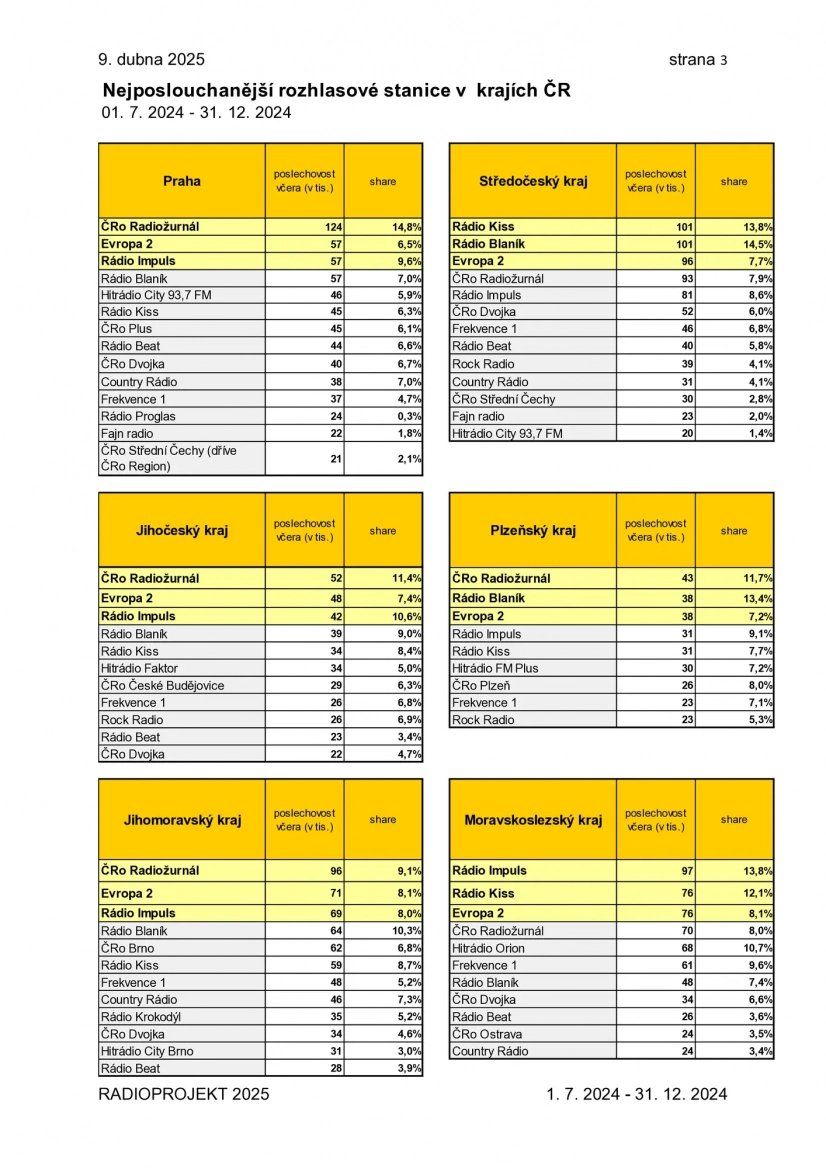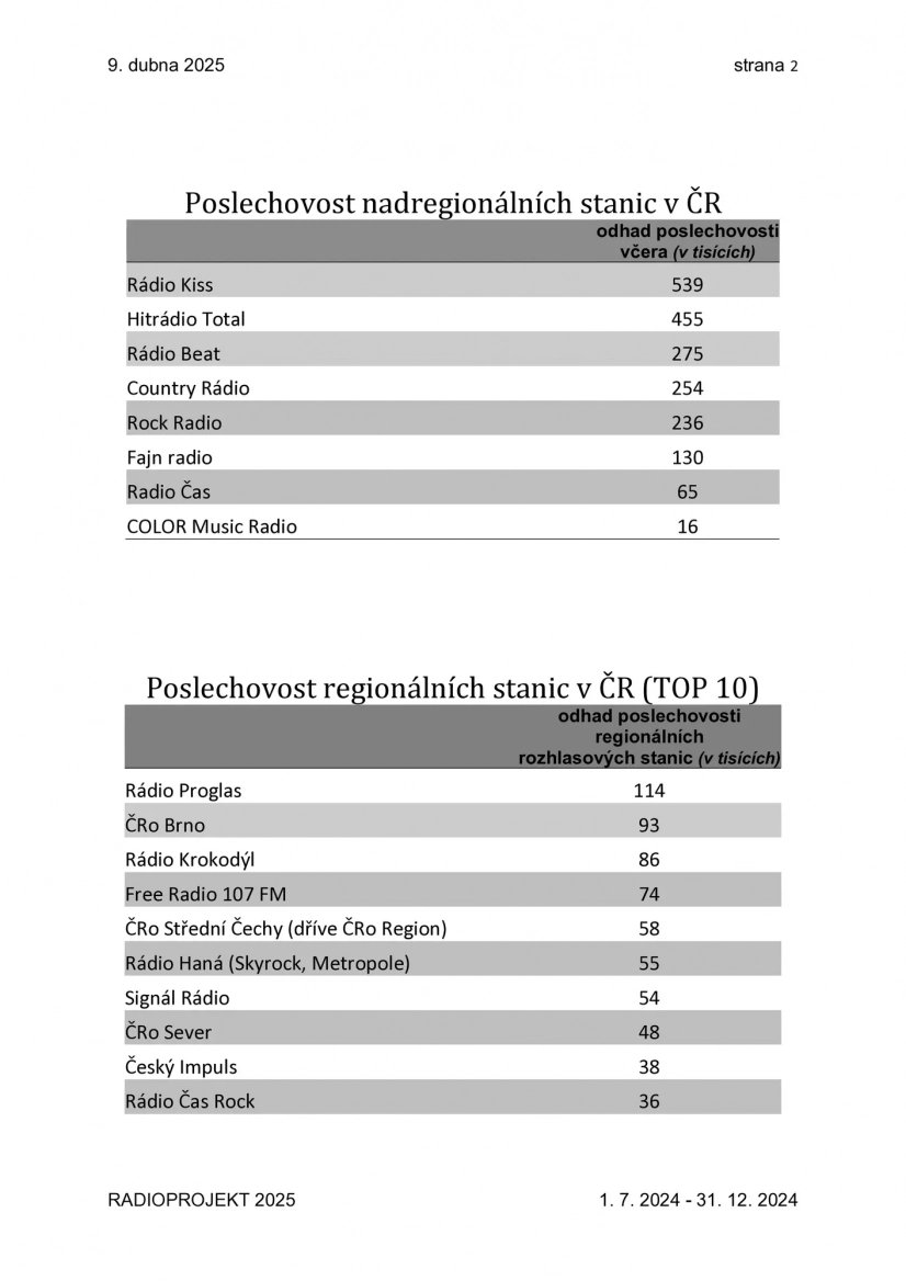 Z nadregionálních sítí je nejúspěšnější Kiss (539 tisíc posluchačů denně a 1,88 milionu týdně). Mezi regionálními stanicemi slaví největší úspěch křesťanské Rádio Proglas se 114 tisíci posluchači denně a 256 tisíci týdně. Předběhlo tak dosud vedoucí brněnské regionální vysílání Českého rozhlasu, které je teď druhé (93 tisíc tisíc denně a 253 tisíc týdně). Třetí je soukromé brněnské Rádio Krokodýl (86 tisíc posluchačů denně a 343 tisíc posluchačů týdně).