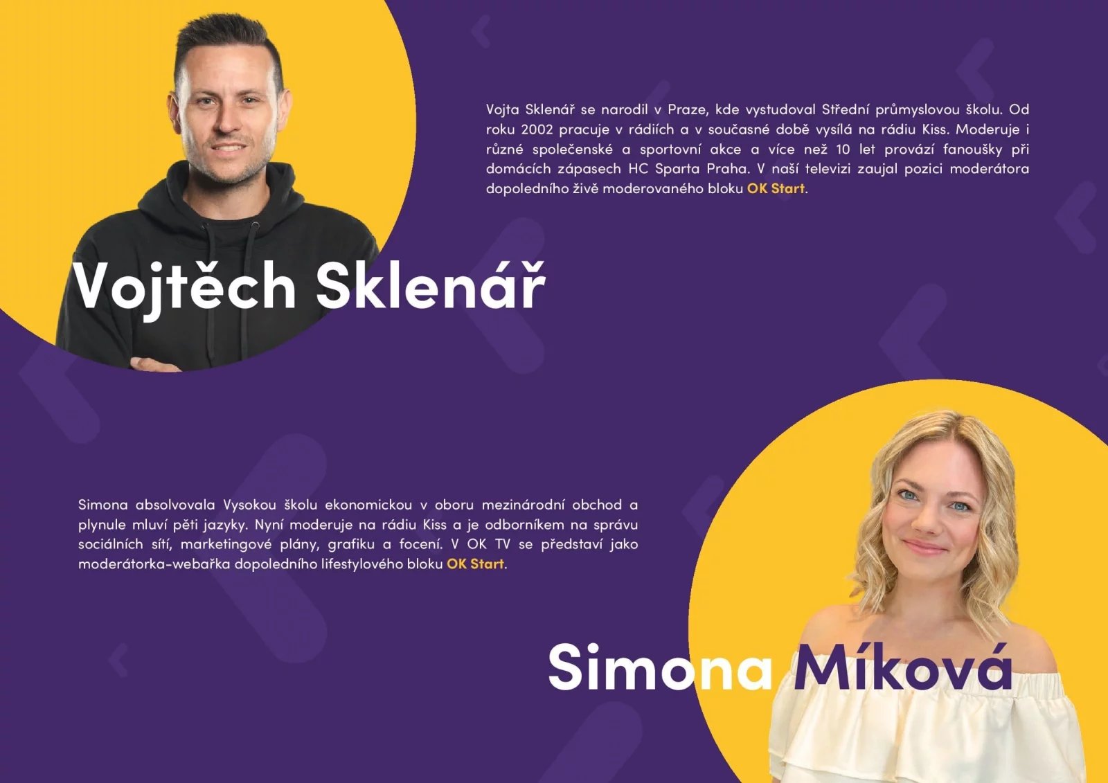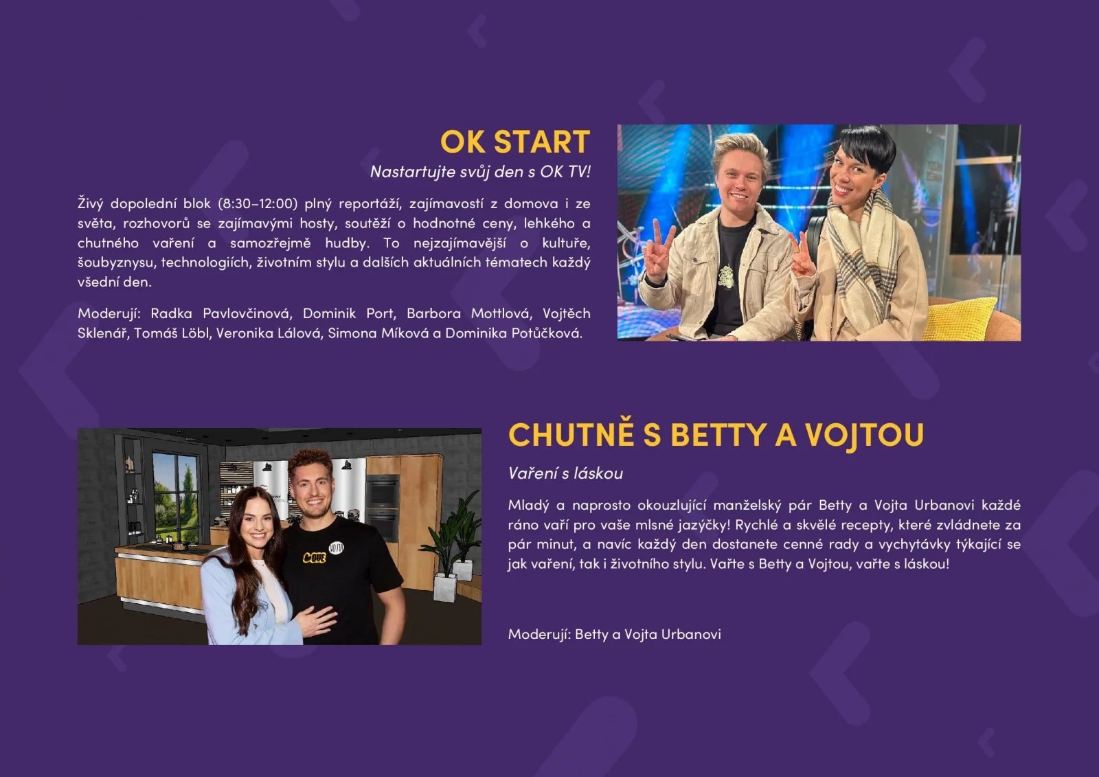 Každý všední den od 8.30 do 12.00 bude živě vysílaný moderovaný blok OK Start. Provázet jím budou tři dvojice: Radka Pavlovčinová a Dominik Port, Bára Mottlová a Vojta Sklenář a Veronika Lálová s Tomášem Löblem. Přivítají různé zpěváky, herce, sportovce nebo odborníky. Součástí bude vaření Chutně s Betty a Vojtou s partnerskou dvojicí Betty a Vojtou Urbanovými.