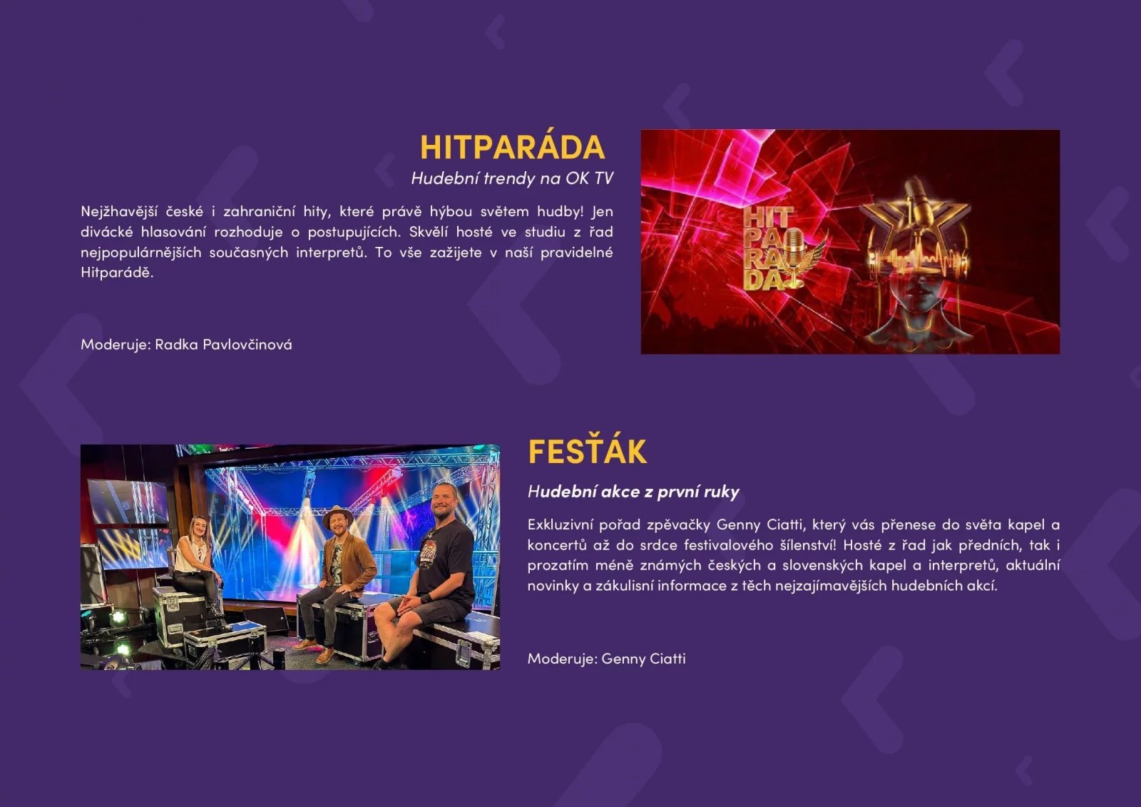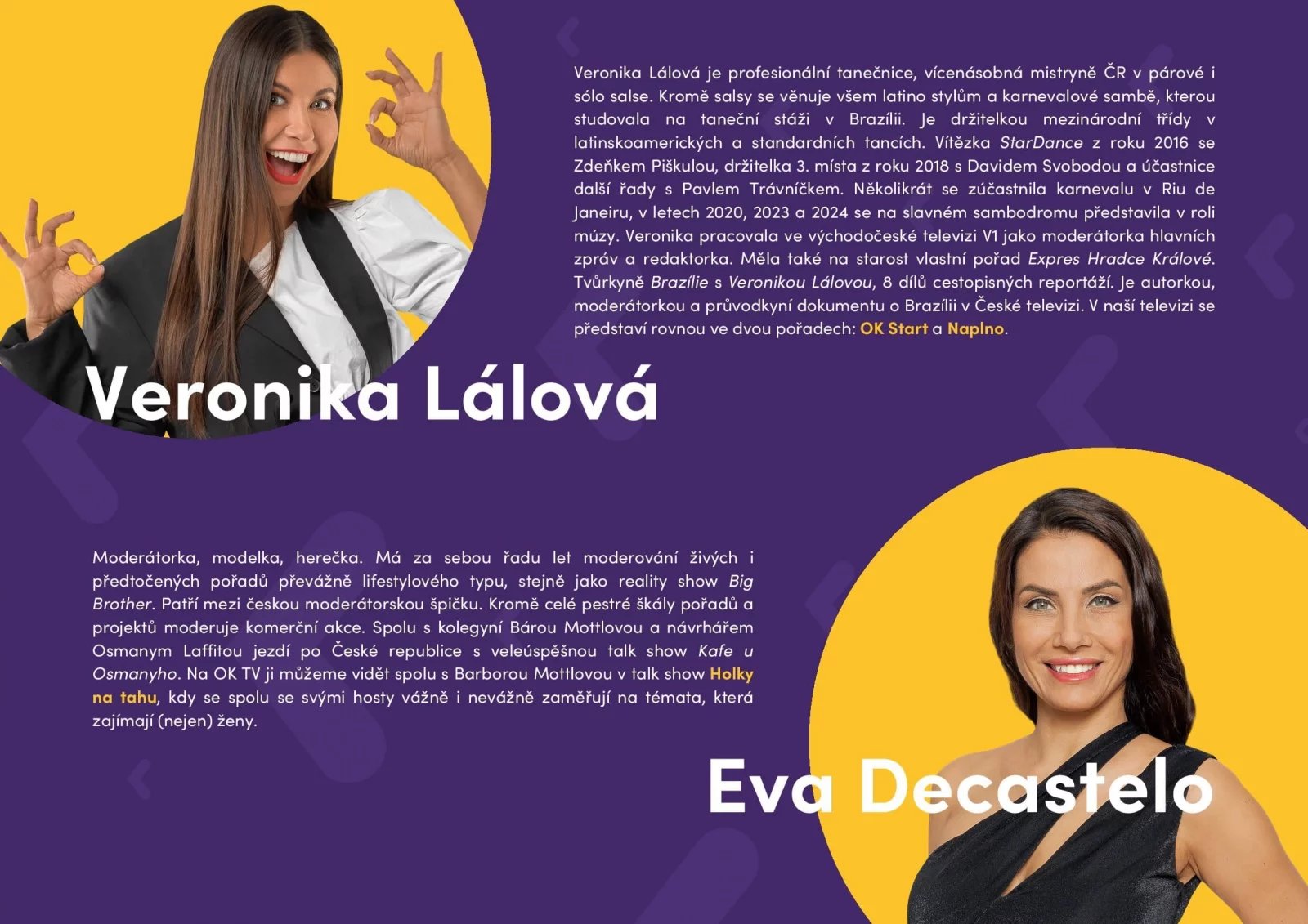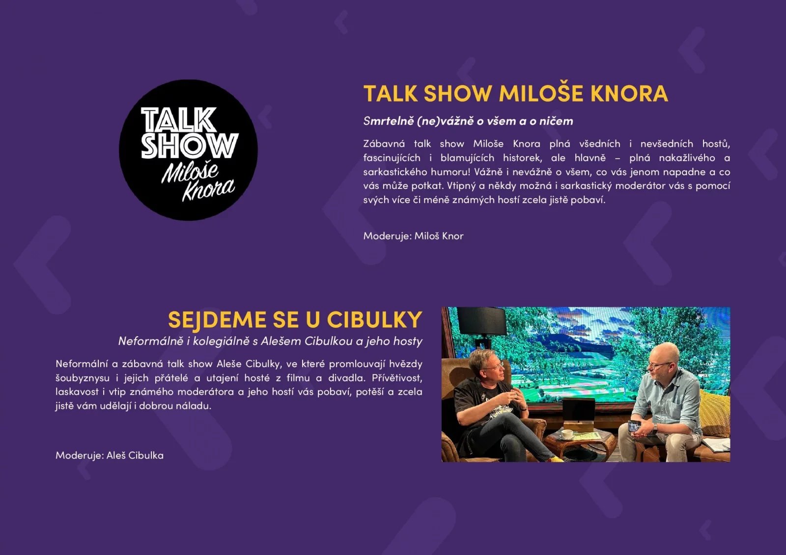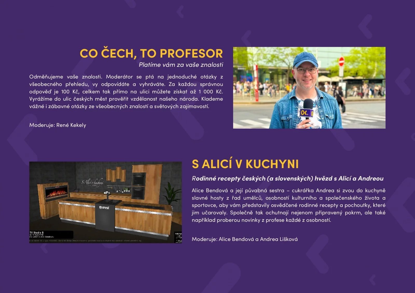 Eva Decastelo a Bára Mottlová si budou s hosty povídat o tématech, která „zajímají (nejen) ženy“ v talk show Holky na tahu. Známé osobnosti přivítá i Aleš Cibulka, který pro OK TV natáčí talk show Sejdeme se u Cibulky. Lehce nekorektní a sarkastický humor a někdy i smrtelně (ne)vážná témata slibuje Talk show Miloše Knora.