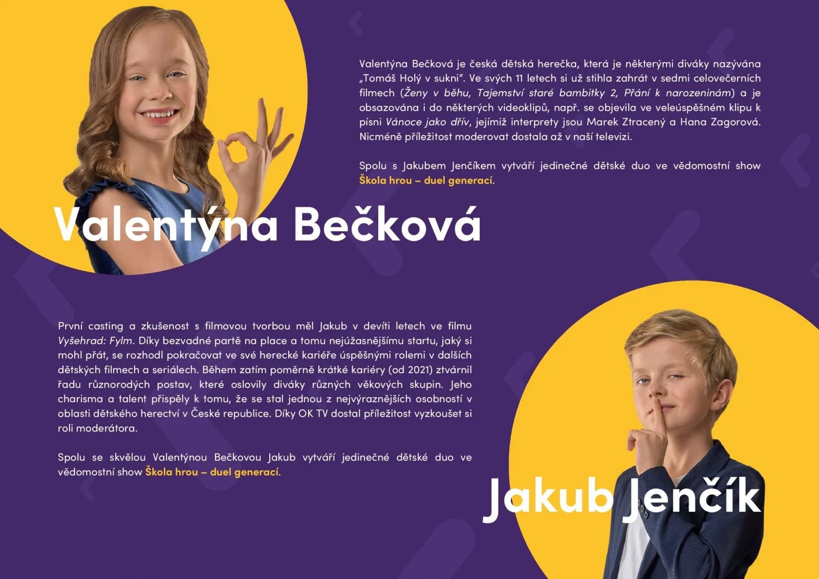 Pro děti bude v programu velký soutěžní pořad Škola hrou s dětskými moderátory Valentýnou Bečkovou a Jakubem Jenčíkem. Postaví se v něm proti sobě děti ze základních škol a dospělí z řad známých osobností.