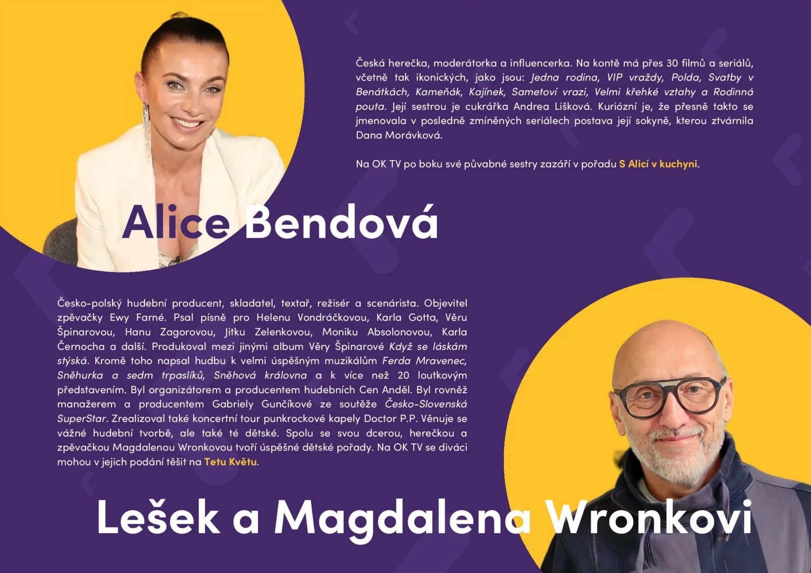 S herečkou a moderátorkou Alicí Bendovou, její sestrou Andreou a jejich hvězdnými hosty mohou diváci OK TV několikrát do týdne vařit i péct v podvečerním pořadu S Alicí v kuchyni.