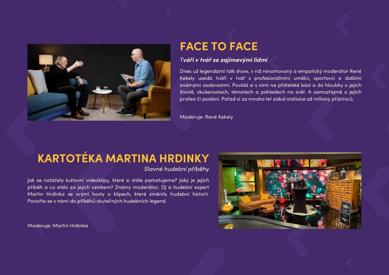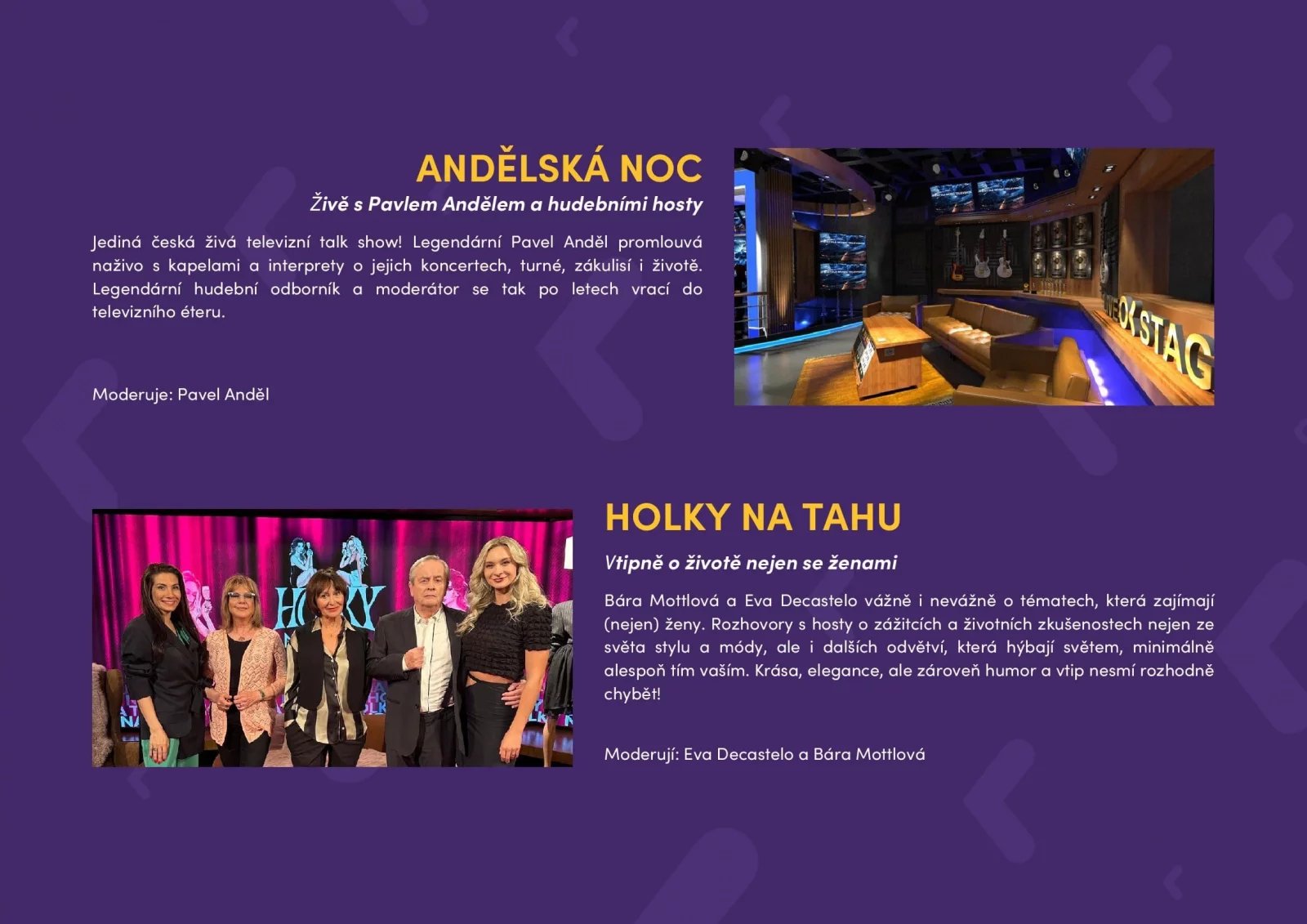 Na hudbu se zaměří Kartotéka Martina Hrdinky, Fesťák s Genny Ciatti, Hitparáda s Radkou Pavlovčinovou a živě vysílaná Andělská noc. Ta bude na programu každou středu, na obrazovky se s ní vrací moderátor Pavel Anděl.