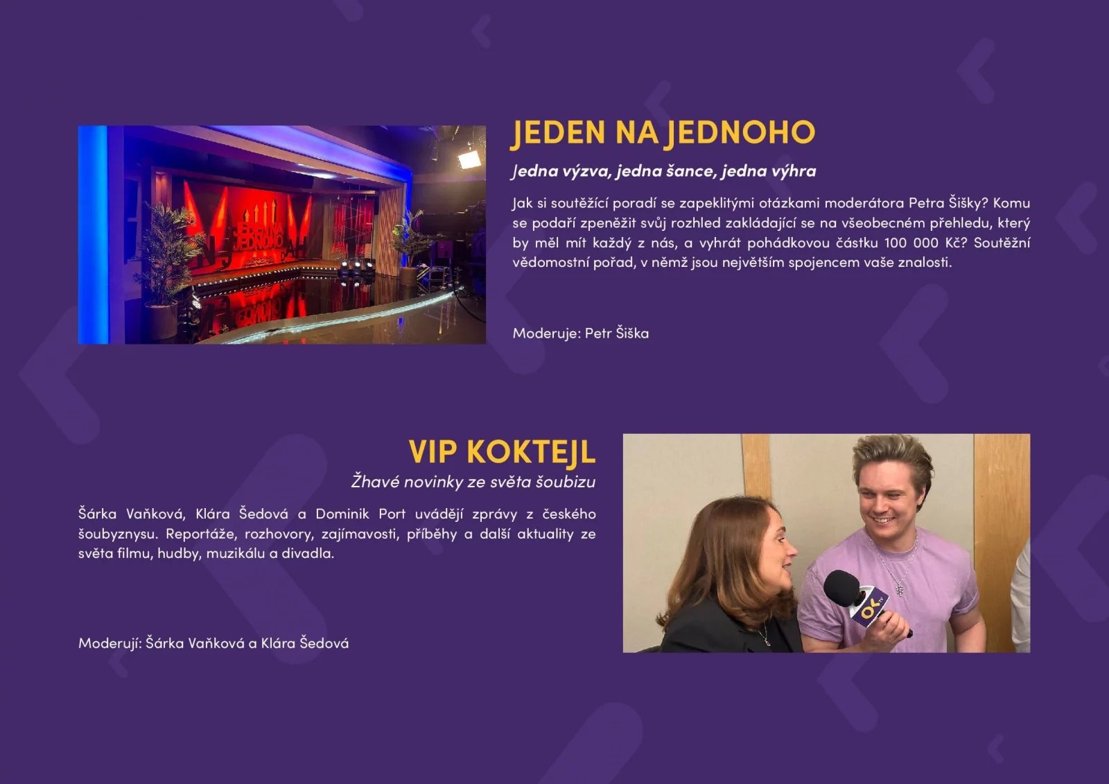 Připravena je vědomostní soutěž Jeden na jednoho s moderátorem Petrem Šiškou, kde diváci mohou získat až 100 tisíc Kč. V další soutěži Co Čech, to profesor zastavuje René Kekely na ulici kolemjdoucí, kterých se ptá na různé otázky. Za každou správnou odpověď dostávají stokorunu, celkově mohou dostat 1000 Kč.