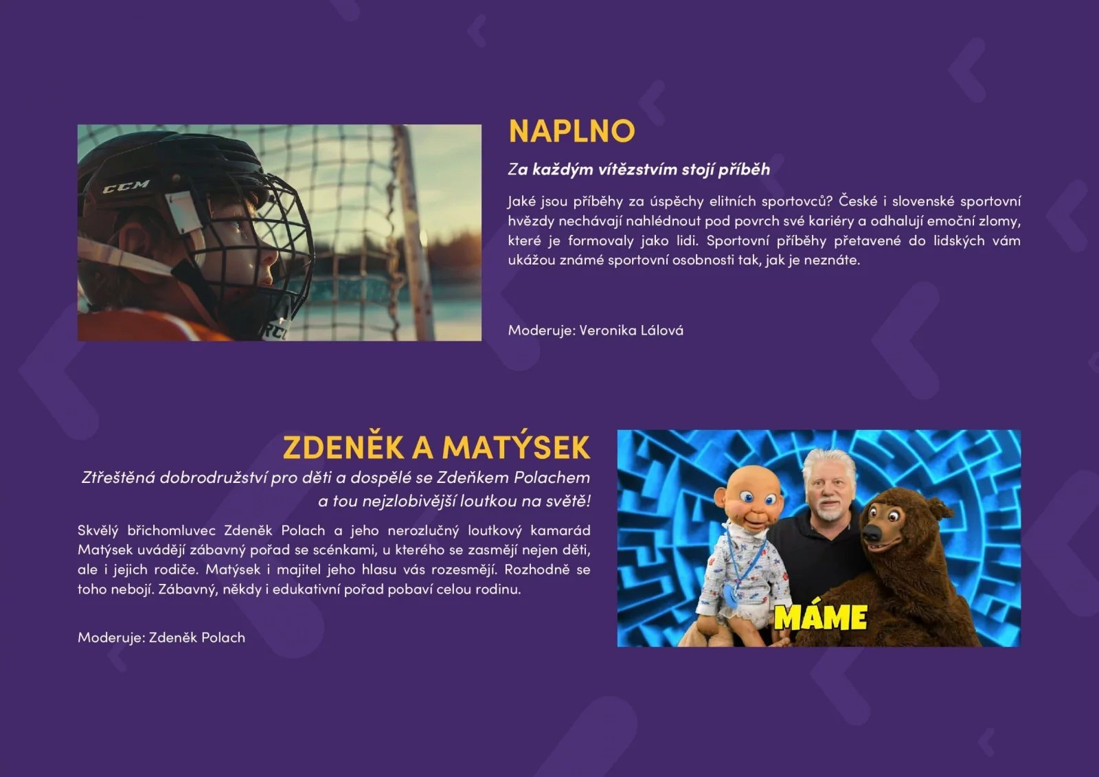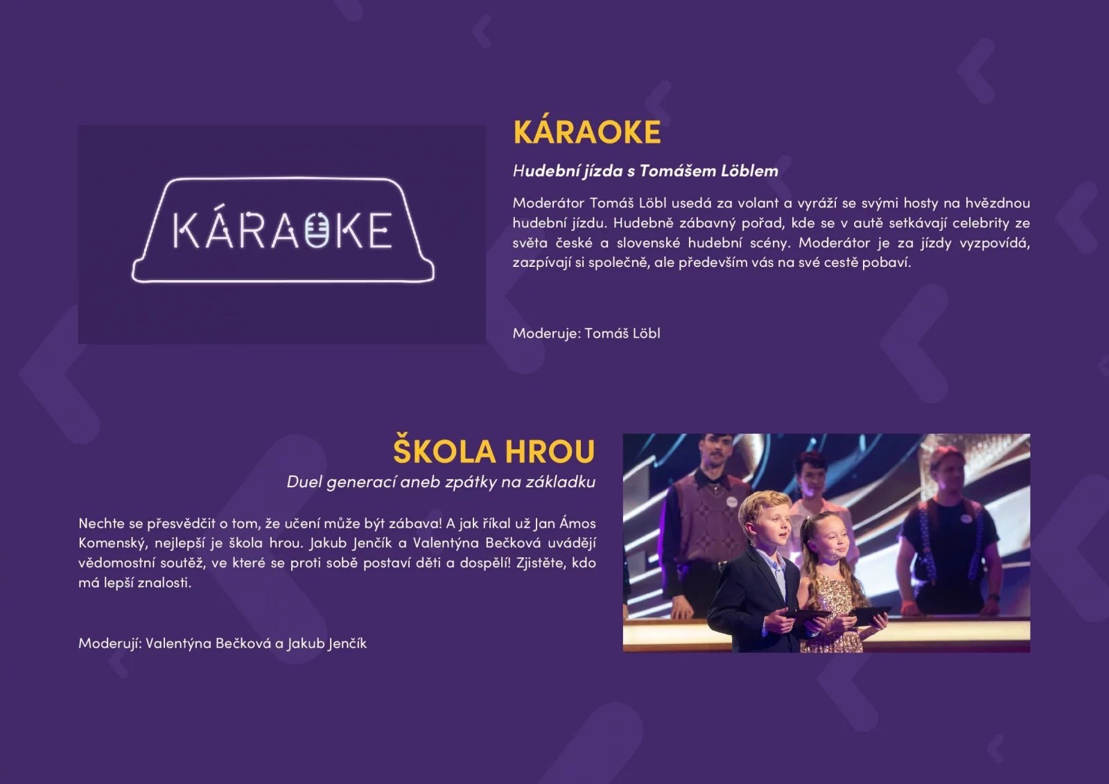 Diváky by měli u vysílání udržet mimo jiné animovaní maskoti, rodina Rybičkových, u kterých se na obrazovce objeví soutěžní QR kódy. „Uvádíme na trh zajímavý model obchodní formy nabízení reklamního času našim partnerům propojený se soutěžením pro diváky. Formou speciálních QR kódů, které si lidé naskenují, si mohou přijít na zajímavé odměny, tedy ceny. A co je důležité: každý člověk, který naskenuje QR kód, vyhrává. Bez jakékoli registrace nebo nutného instalování aplikace,“ dodal Artur Kaiser.