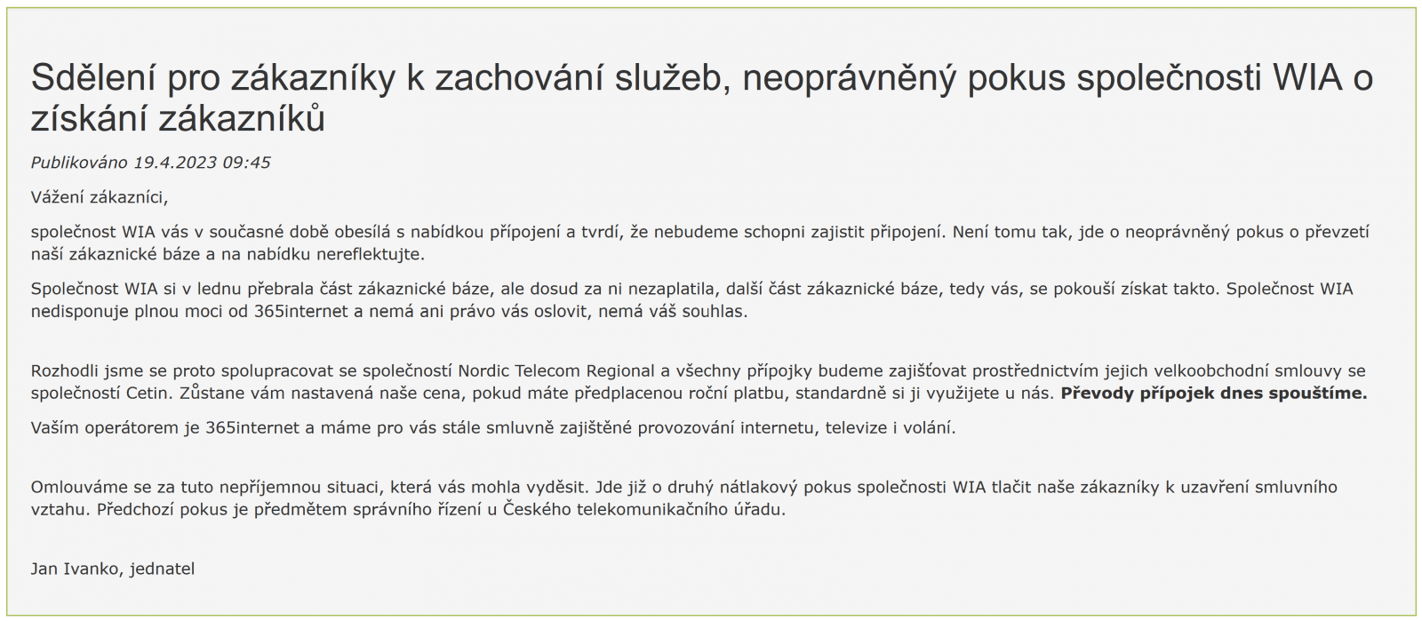S odlišnou verzí příběhu přišel jednatel 365internet Jan Ivanko. Na web umístil sdělení, ve kterém mluví o „neoprávněném pokusu společnosti WIA o získání zákazníků“.