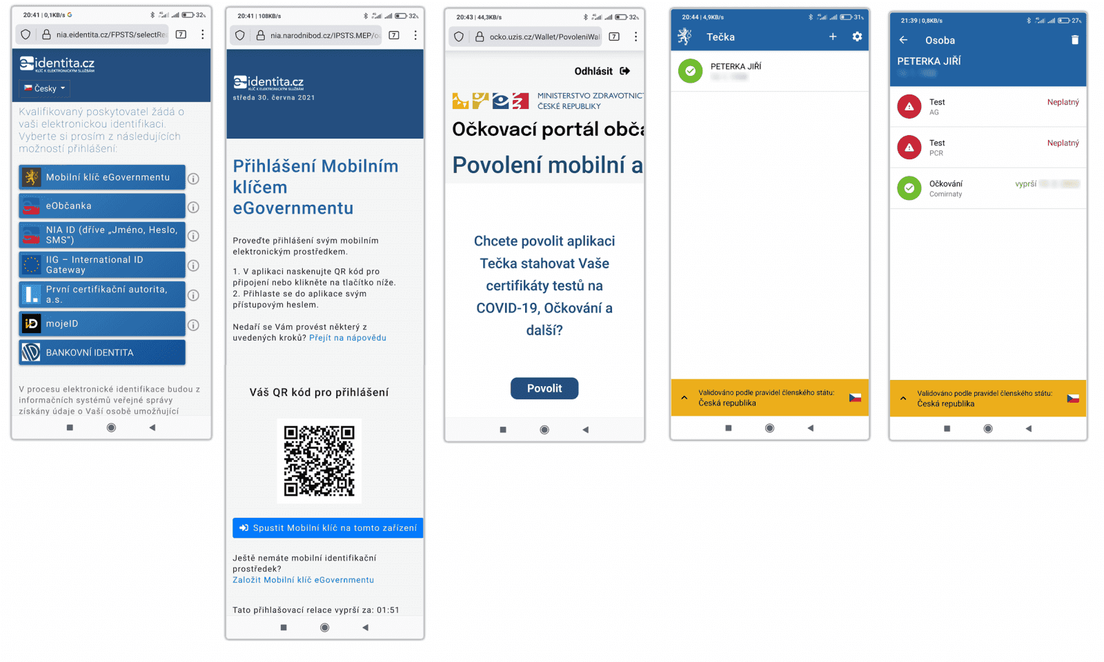 První dvě možnosti se liší podle způsobu přihlašování k očkovacímu portálu: první je „přes NIA“ a příklad jejího průběhu vidíte na následujícím obrázku – až do fáze, kdy si aplikace sama načetla všechny mé aktuálně dostupné certifikáty. S přihlašováním „přes NIA“ to na mobilu nemusí být úplně jednoduché, sám jsem zde použil mobilní klíč eGov, se kterým to šlo celkem pohodlně.