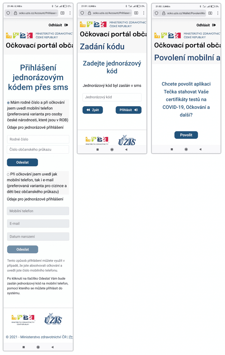První dvě možnosti odpovídají přihlášení konkrétního uživatele k očkovacímu portálu (což aplikaci umožní, aby si sama stáhla všechny aktuálně dostupné certifikáty této osoby). Třetí variantou pak je jednorázové načtení QR kódu optickou cestou.
