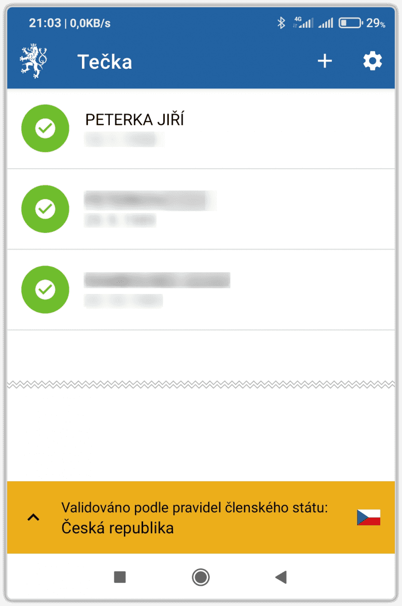 A to „platný“ ve smyslu našich národních pravidel, které jsme si popisovali v minulém článku: antigenní test je v ČR považován za platný 72 hodin, PCR test 7 dnů, očkování 9 měsíců a po prodělané nemoci se pracuje s dobou 6 měsíců. Sama aplikace v tomto ohledu hovoří o „validaci podle pravidel členského státu“, a to ČR.