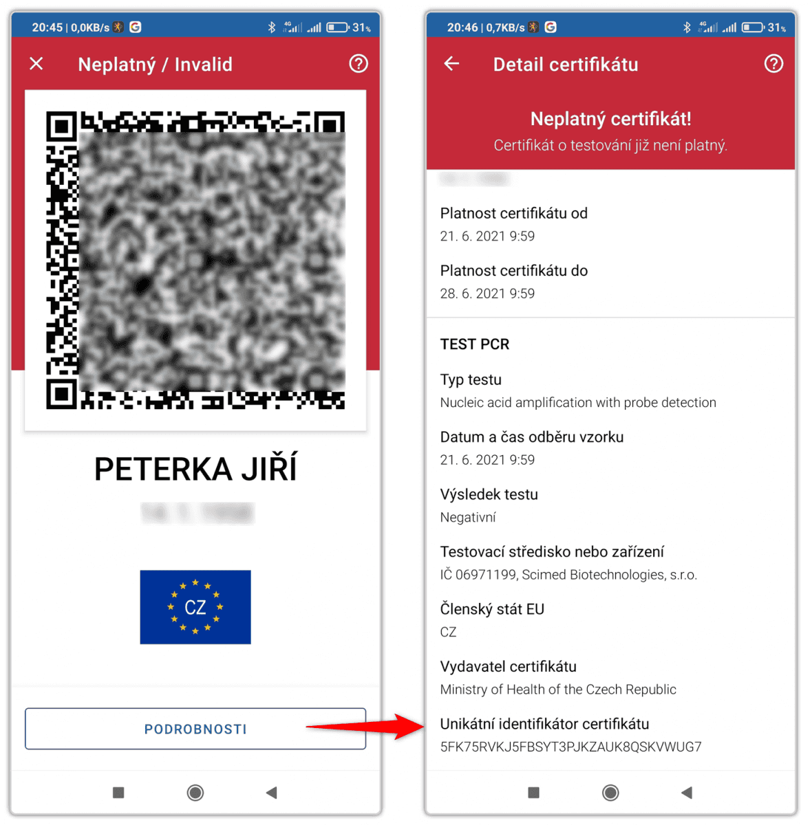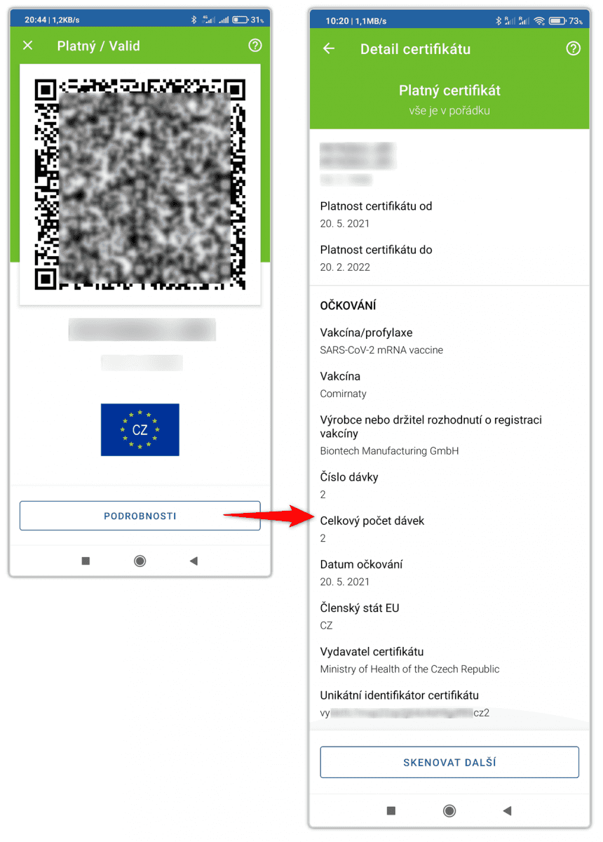 Když si některý z nich vyberete, zobrazí se vám příslušný QR kód a spolu s ním i konstatování, zda je (podle aktuálních národních pravidel) platný (resp. validní). Pochopitelně i s příslušným barevným podbarvením. V případě potřeby je možné si rozkliknout a nechat zobrazit i podrobnosti o certifikátu – viz pravé části následujících dvou obrázků.