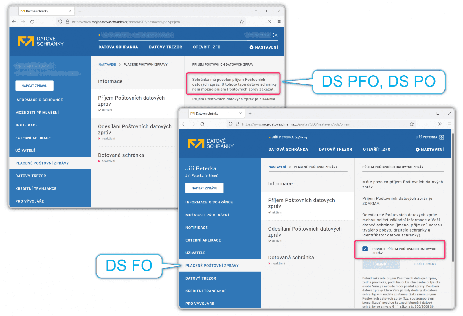 Tvrzení, že poštovní datové zprávy lze posílat do všech datových schránek fyzických i právnických osob, je nutné si trochu upřesnit. Čímž se dostáváme k jedné ze dvou letošních změn. Ještě totiž záleží na tom, zda příslušná datová schránka (DS FO, DS PFO či DS PO) má příjem poštovních datových zpráv povolen, či nikoli.