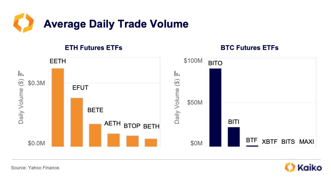 Dvě největší ETF co do objemu obchodů – EFUT společnosti VanEck a EETH firmy ProShares – zaznamenaly během prvního týdne průměrný denní objem obchodů jen ve výši pouhých půl milionu amerických dolarů. Když se spouštělo první ETF založené na bitcoinových futures, tedy ETF – ProShares Bitcoin Strategy (BITO), dokázalo během prvního dne obchodování přilákat objem obchodů přesahující jednu miliardu dolarů.