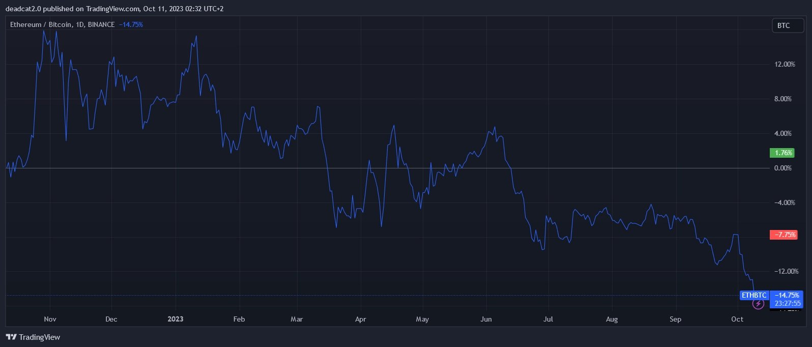 Tedy, řeč je pochopitelně o vývoji hodnoty obou populárních kryptoaktiv, nikoli celkovém směřování obou sítí. V posledních dnech ale tento trend přestal platit a zdá se, že na to bylo zaděláno vlastně již docela dlouho. Cena etheru, tedy nativní jednotky Ethereum sítě, začíná oproti bitcoinu výrazně zaostávat. Co se stalo?