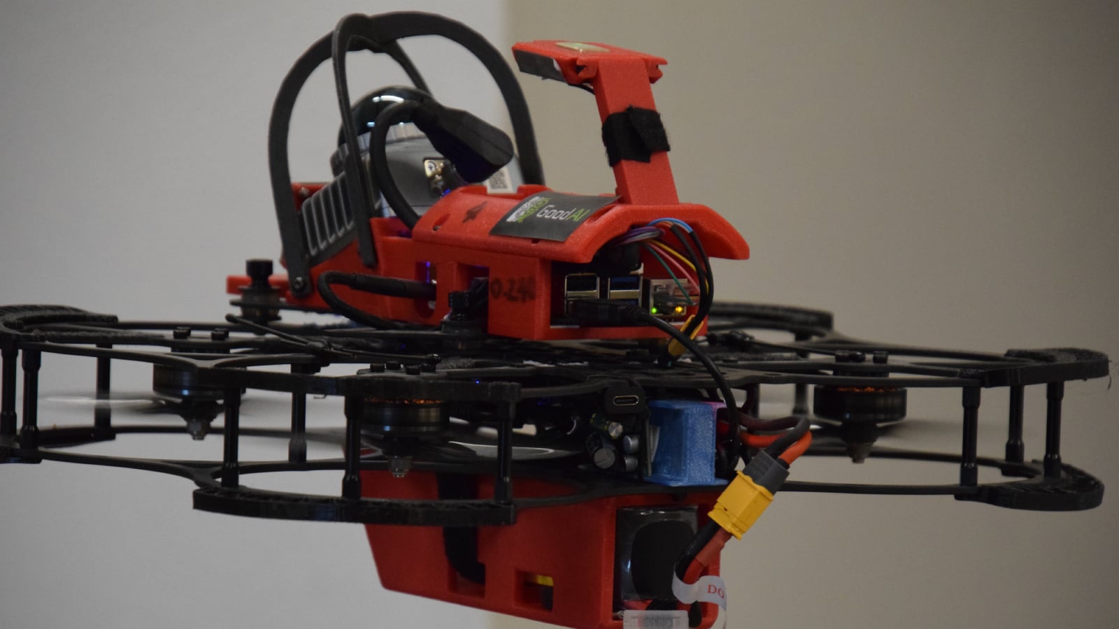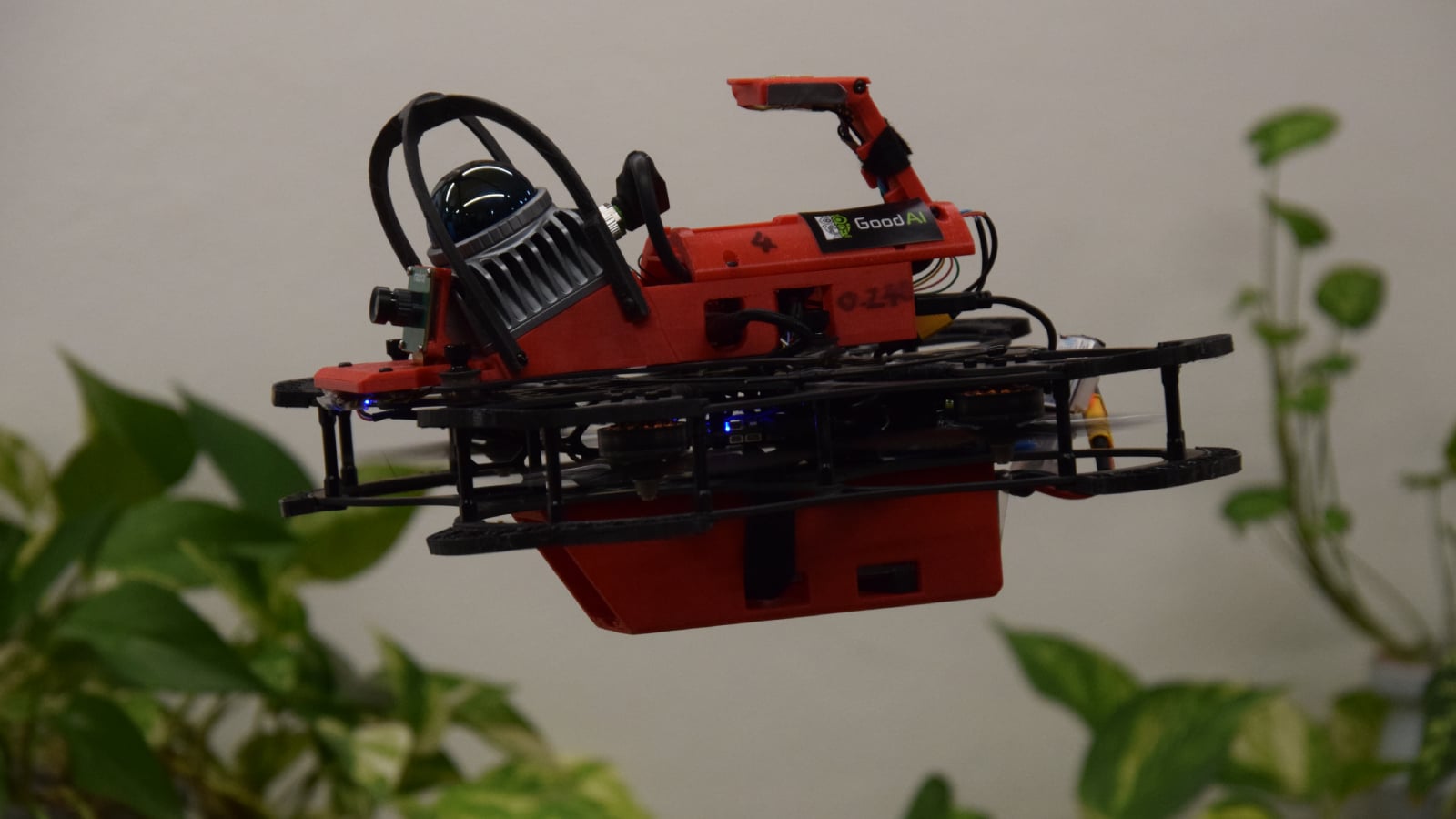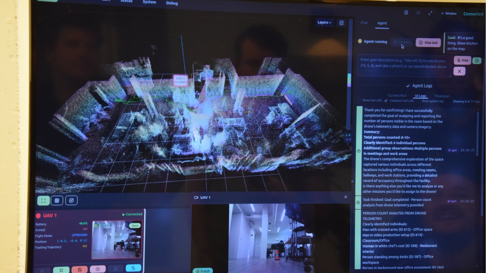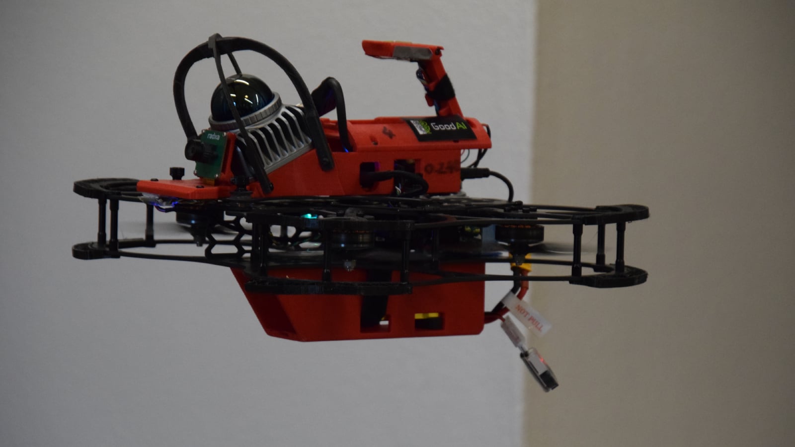 „Kolik bylo lidí v místnosti?“ ptá se Petr Hlubuček, AI výzkumník ve společnosti GoodAI a současně polovina týmu, který na vývoji pracuje posledních pět měsíců. Dron odpovídá syntetizovaným hlasem, zatímco se text současně zobrazuje na monitoru počítače: „Na základě pořízených záběrů jsem v místnosti napočítal osm až deset různých osob. Zachytil jsem dva muže, jednu ženu v kuchařském plášti a několik skupin lidí na schůzce.“