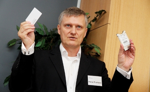 Šéf strategie a rozvoje Českých Radiokomunikací Marcel Procházka demonstruje způsob příjmu placené televize přes DVB-T2. Právě o kmitočty pro sítě "druhé generace" se bude v nejbližších letech hrát především.