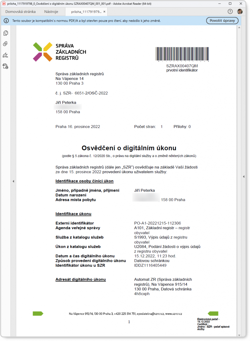 K 1. únoru nabyla účinnosti některá další práva z tzv. digitální ústavy (zákona č. 12/2020 Sb.). Jde například o právo na osvědčení o digitálním úkonu, které by mělo být jakýmsi potvrzením či dokladem pro uživatele, že vznesl nějaký požadavek vůči orgánu veřejné moci (učinil vůči němu „úkon“). Existuje i oficiální vzor toho, jak by takové osvědčení mělo vypadat.