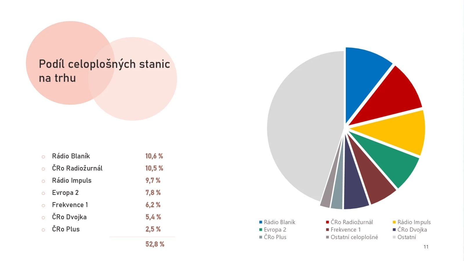 Z hlediska celkového podílu na poslechovosti vede Rádio Blaník s hodnotou 10,6 procenta, čímž o pouhou desetinu poráží Radiožurnál. Blaník má obecně velmi loajální publikum, měsíčně osloví přes 4,2 milionu posluchačů. Třetí místo z hlediska podílu na trhu patří Rádiu Impuls s necelými deseti procenty.