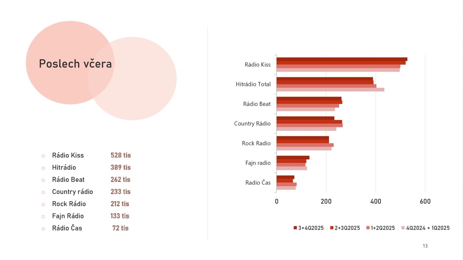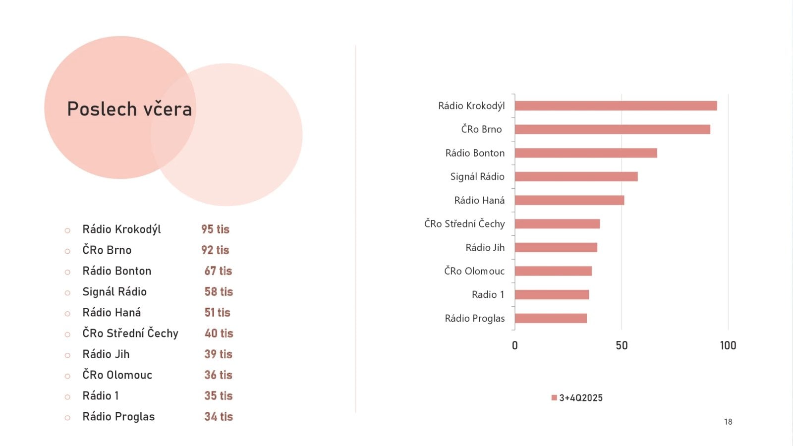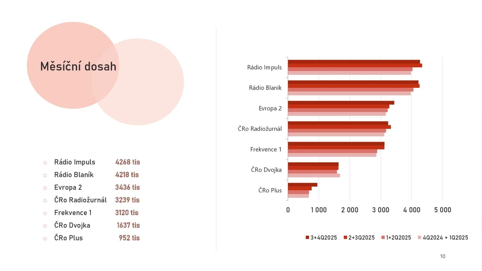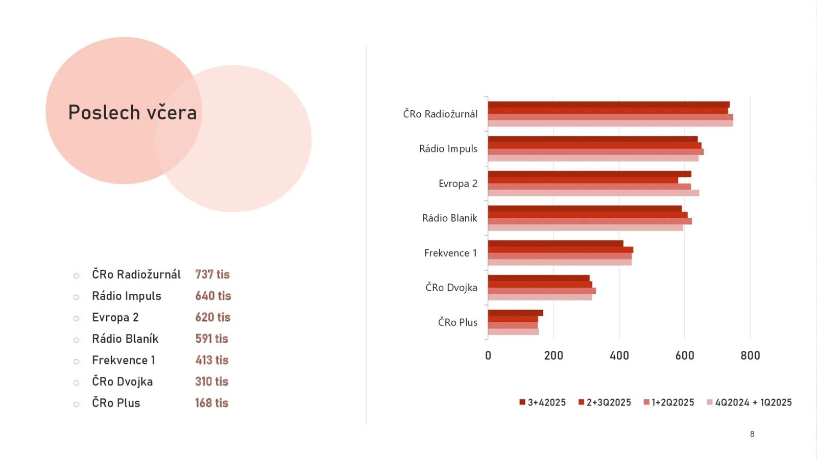 Žebříčku živé denní poslechovosti vévodí stabilně Radiožurnál se 737 tisíci věrných posluchačů (jeho týdenní dosah je 1 milion 757 tisíc posluchačů). Pomyslné stříbro si odnáší Rádio Impuls, to si zapíná 640 tisíc lidí denně. V týdenním dosahu je naopak první, zapínají si ho v průměru 2 miliony a 85 tisíc posluchačů.