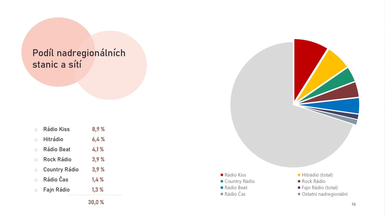 Své věrné posluchače si hýčkají i žánrově vyhraněné stanice jako Rádio Beat nebo Country Rádio, které shodně oslovují výrazně přes 200 tisíc lidí denně. Úspěšně si vede také Rock Rádio, jehož programový ředitel Martin Drtina zdůrazňuje úspěch nové ranní show a stabilní měsíční zásah přesahující hranici 1,7 milionu rockerů. Mladší publikum naopak úspěšně a stabilně přitahuje Fajn rádio.
