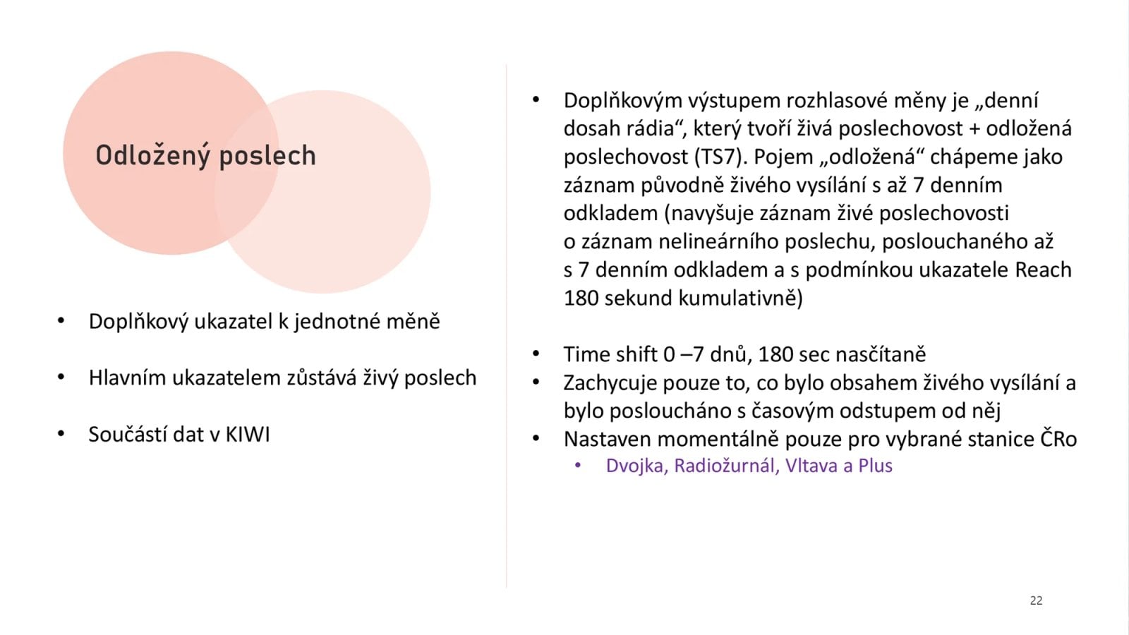 Posluchači už dávno nespoléhají pouze na živé vysílání. Metodika takzvaného time shiftu proto zohledňuje chování uživatelů, kteří si oblíbené pořady pustí se zpožděním až sedmi dnů. Výzkumníci přitom započítávají zájemce, kteří obsahu věnují alespoň tři minuty svého času. Do měření jsou zařazeny pouze odložené poslechy pořadů, programových bloků, které prošly živým vysíláním sledovaných stanic.