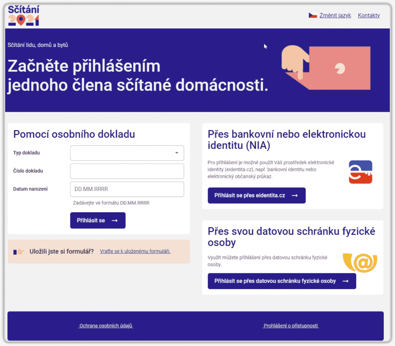 Pokud se respondent vydá cestou webových stránek (tj. nikoli cestou mobilní aplikace), může začít na oficiálních stránkách letošního sčítání, na https://scitani.cz/, nebo na https://onlinescitani.cz. Odsud by (od 27. 3.) měla být dostupná možnost přihlášení ke sčítacímu formuláři v podobě dle následujícího obrázku.