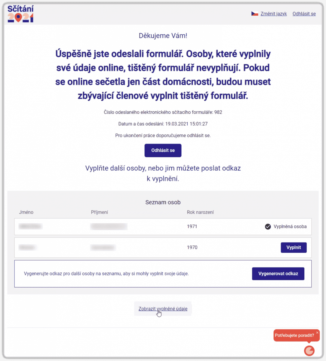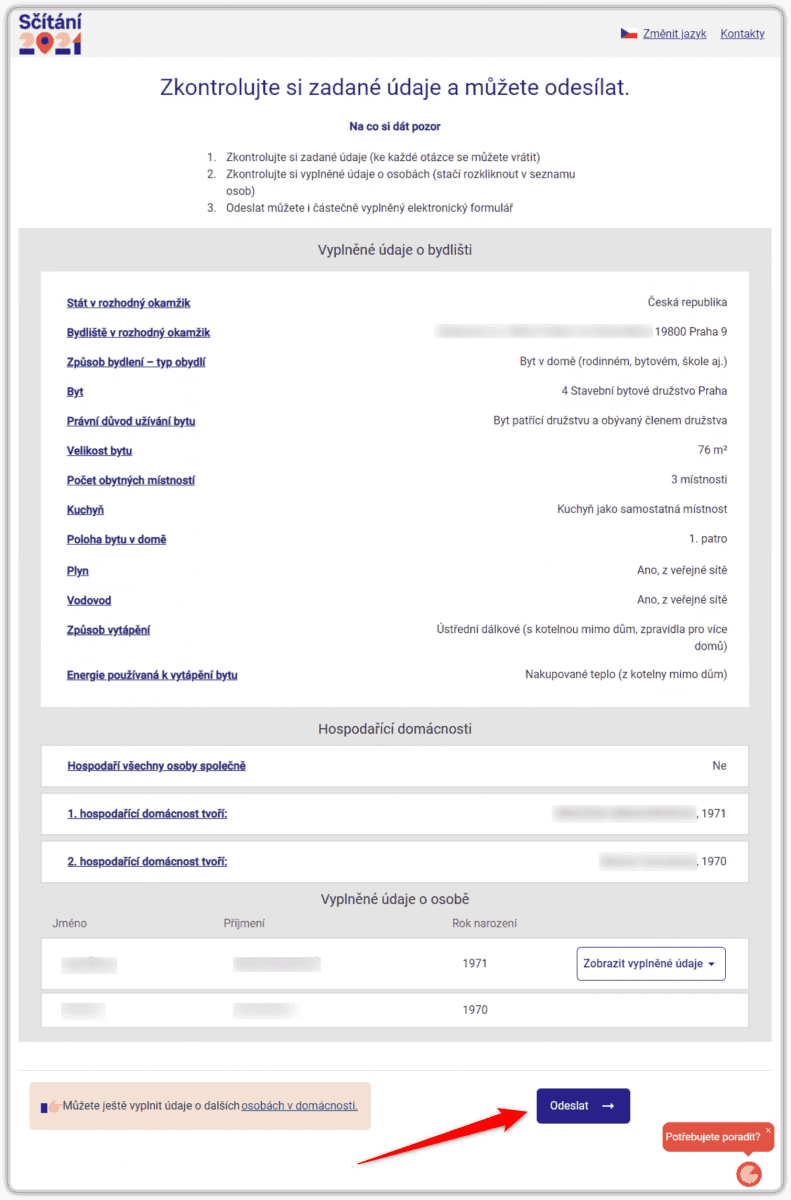 Tato možnost („dovyplnění“) má samozřejmě svá pravidla. Například to, že respondent musí alespoň vyjmenovat tyto další osoby (zadat jejich jméno a příjmení) a uvést i rok jejich narození. Pak může formulář odeslat i bez vyplnění požadovaných údajů o těchto dalších osobách a nechat dovyplnění na nich.