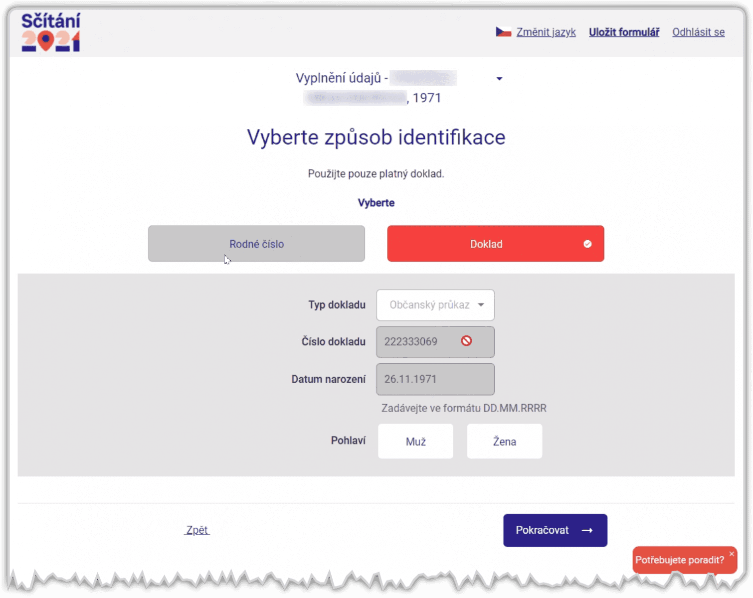Zde si zdůrazněme, že jediný rozdíl mezi vyplňováním údajů o respondentovi (který je vždy první osobou na seznamu) a o ostatních osobách se týká jejich identifikačních údajů. Ve formuláři totiž musí být zadány takové údaje, které umožňují tuto osobu jednoznačně identifikovat. Konkrétně musí být zadáno buď její rodné číslo, nebo číslo (a typ) osobního dokladu a datum narození.