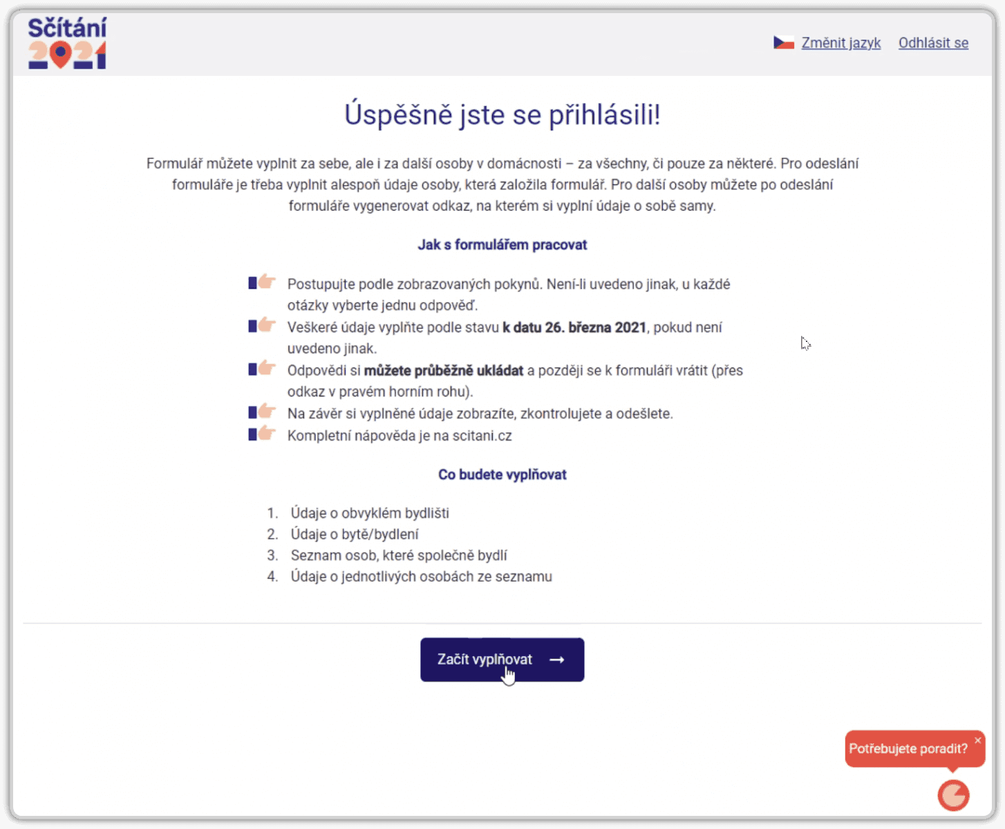 Po úspěšném přihlášení (k novému a prázdnému formuláři) je uživatel stručně seznámen s tím, co ho čeká a co by měl udělat. K dispozici má i chatbot, se kterým se může poradit (ten je k dispozici i před přihlášením, aby pomáhal i s ním).