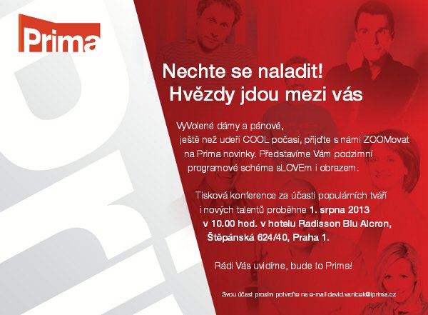 10:11 – Hlavním sloganem Primy pro podzim bude heslo: „Hvězdy jdou mezi vás“. Tiskovku zahájil tiskový mluvčí Primy David Vaníček.