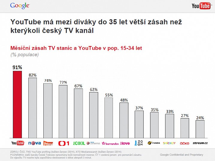 Roli největšího televizního kanálu v Česku přebírá internetová videoslužba YouTube. U diváků do 35 let má větší zásah než hlavní programy Novy a Primy, konkrétně u populace od 15 do 35 jej měsíčně využívá 91 procent respondentů. Hlavní kanál Novy má ve stejné cílové skupině měsíční zásah 82 procent populace a hlavní kanál Primy 74 procent, vyplývá z průzkumu agentury TNS Aisa. „Populární je nejen u mladé generace, v celé cílové skupině 15 – 54 let má více než 80-procentní zásah. Sledováním YouTube tráví lidé týdně podobně času jako u největších českých TV kanálů, přičemž nárůst zhlédnutí je tažený zejména mobilem,“ vyplývá ze studie.